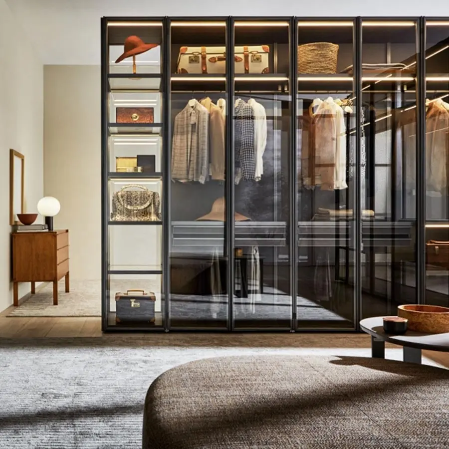 Las puertas GLASS están realizadas con bisagras 180° empotradas en el lateral (exclusiva Molteni). Soluciones tecnológicas avanzadas, entre otras, mecanismos de deslizamiento, solapados y coplanares, que utilizan un sistema de amortiguadores magnéticos que eliminan el ruido en fase de activación. Este sistema precisa de menos fuerza para abrir y cerrar la puerta, mejorando la fluidez de deslizamiento. El sofisticado porta-camisas extraíble, los cajones y las bandejas extraíbles, los estantes zapateros, los accesorios como el porta-corbatas, los porta-joyas en «eco piel» rubí y gris y el nuevo sistema de iluminación de led son algunas de las novedades que se proponen.