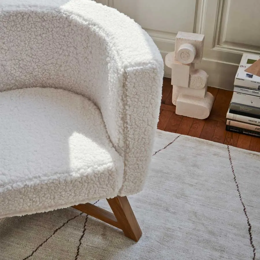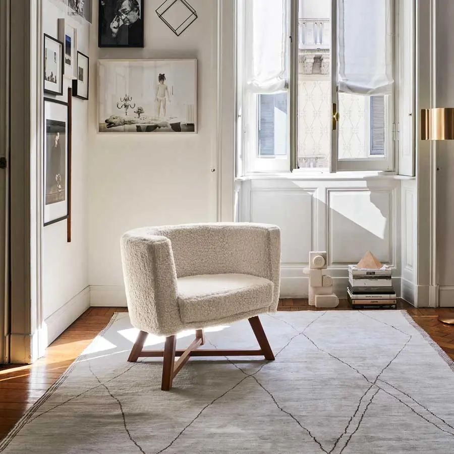 Gray 08 es un sillón de madera caracterizado por un envolvente respaldo bajo en forma de semicírculo, relleno de poliuretano expandido con funda extraíble. Las patas de madera maciza se intersecan formando una cruz. La estructura está realizada de nogal Canaletto pintado natural, roble blanqueado o roble lacado en blanco, gris, negro, océano o tórtola.