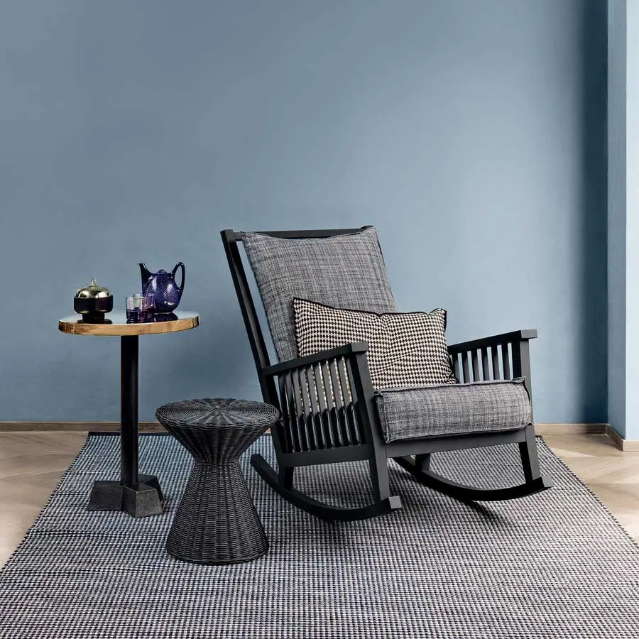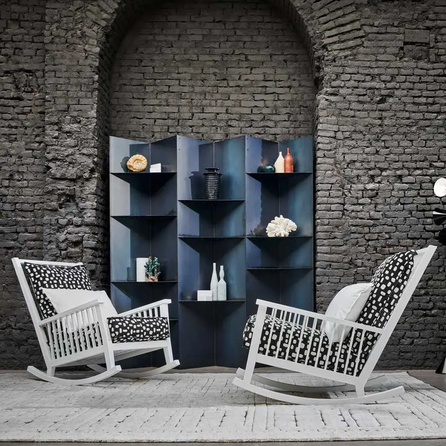 La mecedora de madera Gray 09 se caracteriza por un alto respaldo con duelas a la vista sobre el que está apoyado un suave cojín suelto. La estructura, con un amplio y confortable asiento, está realizada de nogal Canaletto pintado natural, roble blanqueado o roble lacado en blanco, gris, negro, océano o tórtola.