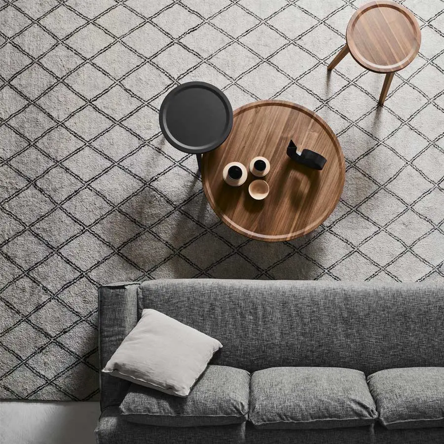 Familia de mesas de centro bajas de tres patas, Gray 46/46 R/49/49 R se caracterizan por un tablero redondo y por geometrías limpias y esenciales. Disponibles en dos diámetros, pueden tener el tablero de madera maciza de nogal o roble. Una particularidad de estas mesas de centro es el borde del tablero, que tanto a la vista como al tacto, resulta ligeramente elevado, casi como simulando una bandeja. Los acabados de madera disponibles son: nogal Canaletto pintado natural, roble blanqueado o roble lacado en blanco, gris, negro, océano o tórtola.