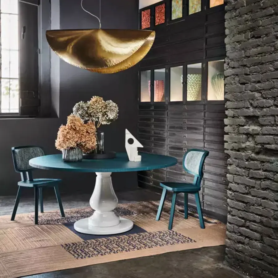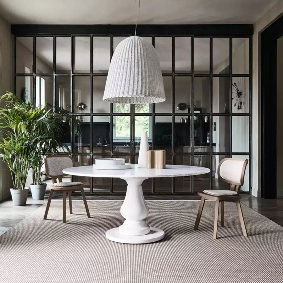 La mesa GRAY 38 se caracteriza por un perfecto equilibrio entre materiales diversos, para una propuesta con espíritu transformista. La pata central escultórica, de gres blanco, elegantemente torneada, puede combinarse con un tablero de duelas de nogal o roble disponible en los colores de la colección o de mármol blanco Carrara.