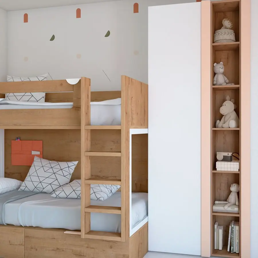 Con Jota Jota P podemos diseñar la habitación en función del espacio y los gustos. En este caso, tenemos una litera para dos colchones de 190×90 con protector extraíble. Dos armarios con un módulo de estanterías.