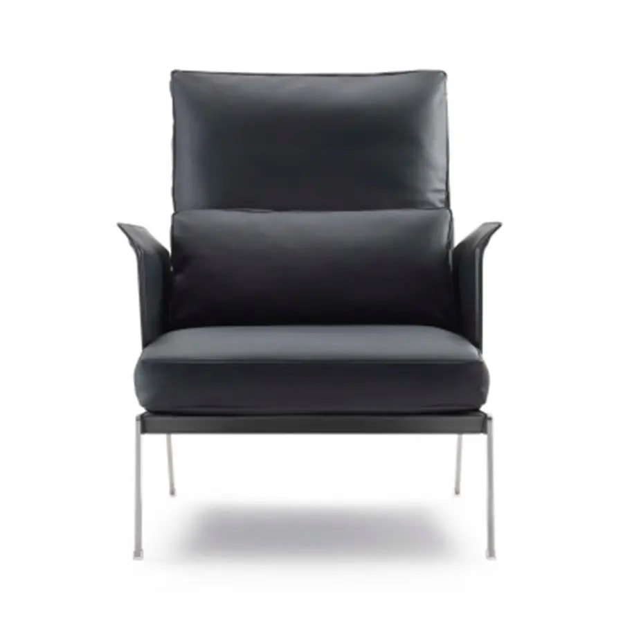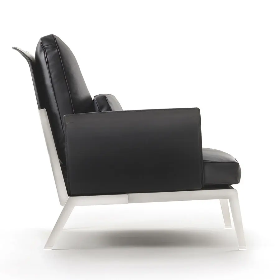 Happy-hour es un sillón de líneas esbeltas y esenciales que, no obstante, expresa una elegancia refinada en la elección del material: el cuero, dúctil y precioso. La estructura de los reposabrazos y del respaldo es de metal completamente recubierto de cuero, mientras que la refinada base de soporte en el suelo está hecha de metal en los acabados satinado, cromado, bruñido, cromado negro y champán. Se pueden crear innumerables combinaciones con la estructura de cuero y los cojines del asiento y el respaldo tapizados con las telas y pieles de la extensa colección Flexform.