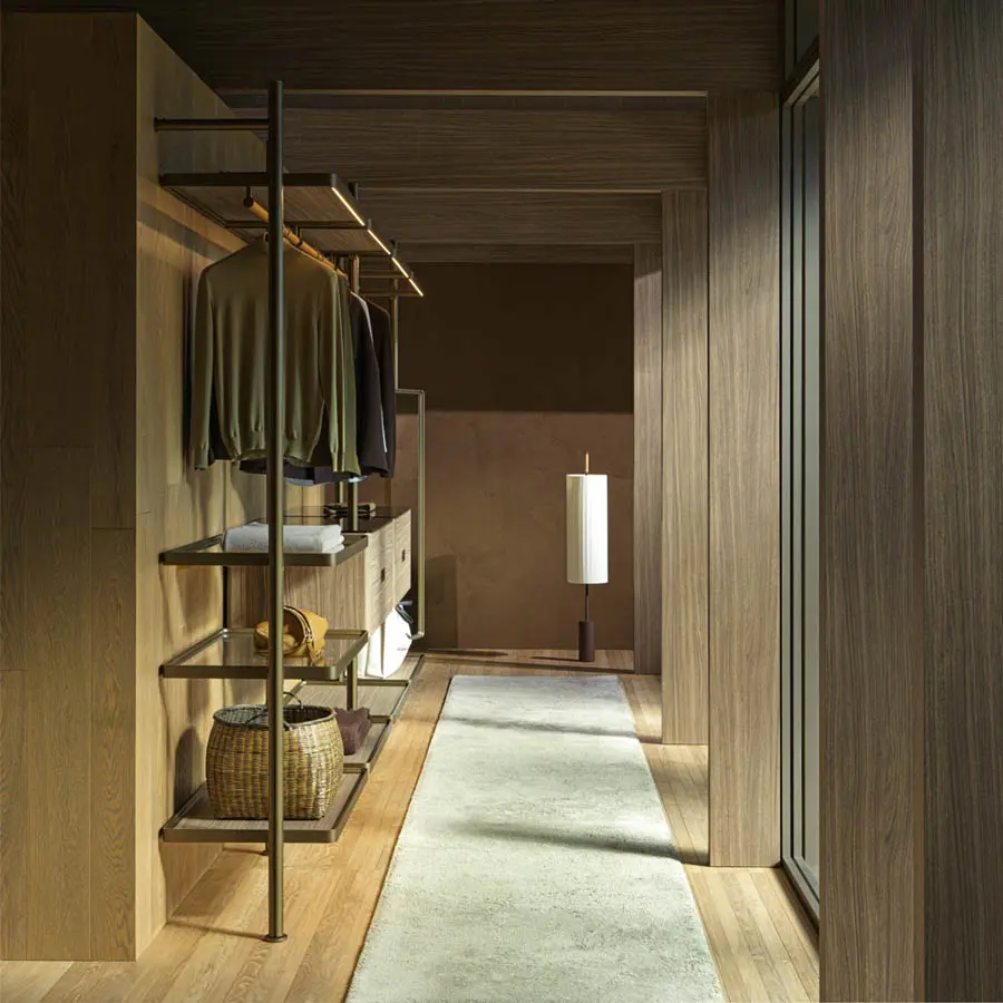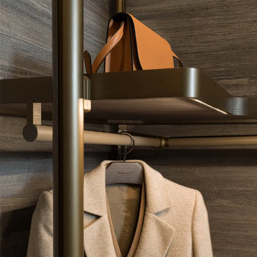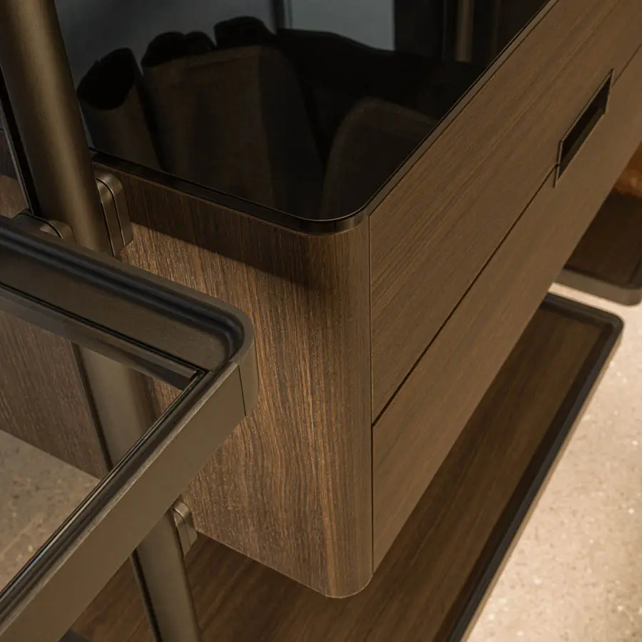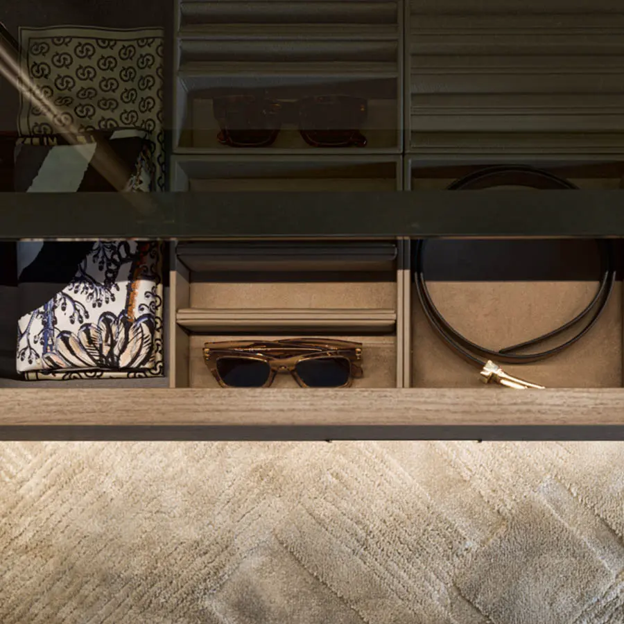 Con el objeto de seguir siendo fiel a la practicidad y la funcionalidad sin olvidar la elegancia y el gusto por los detalles sofisticados, cada estante puede personalizarse en su interior, utilizando tanto el cristal como el panel melamínico o en ecopiel.