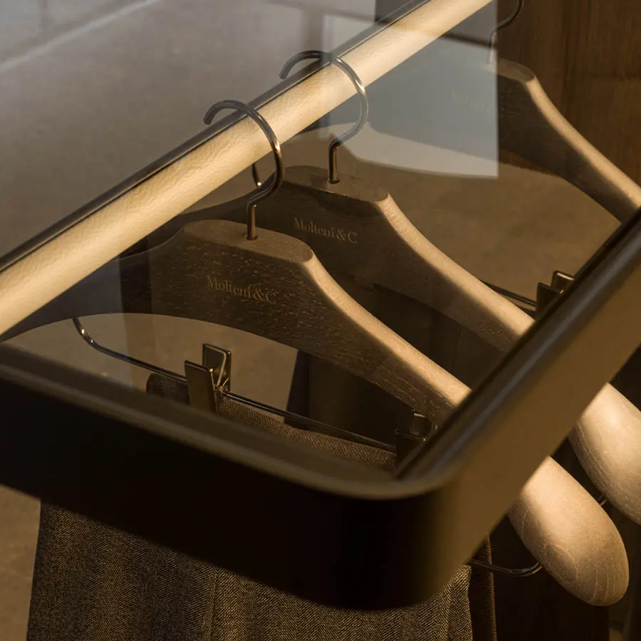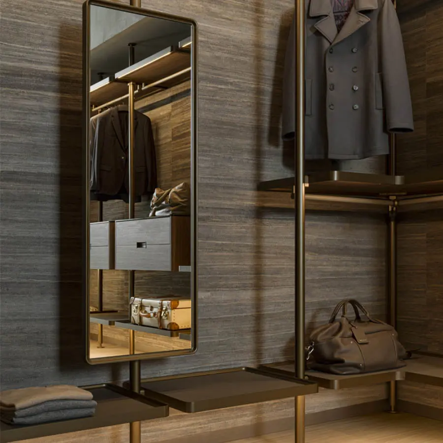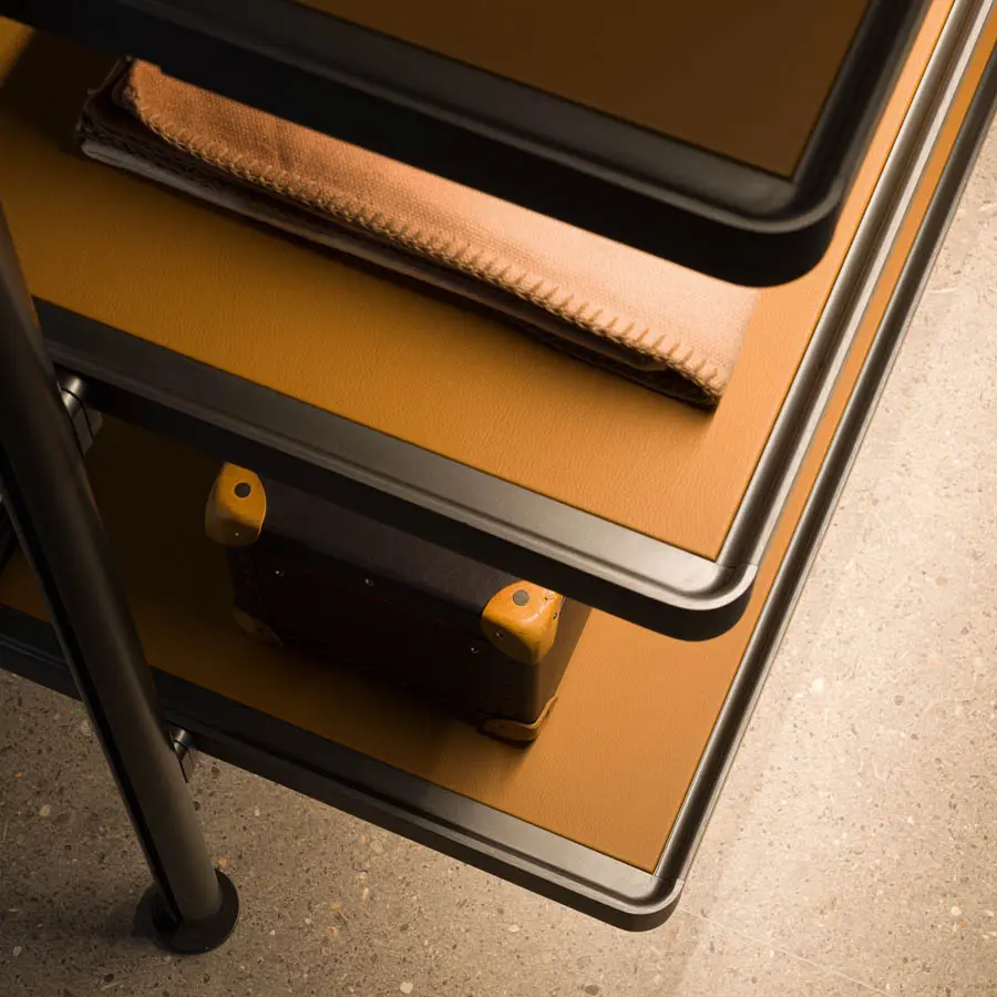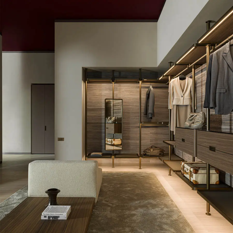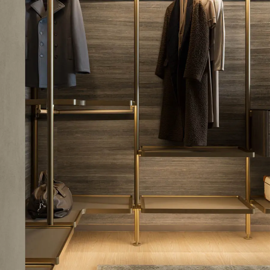 Con el objeto de seguir siendo fiel a la practicidad y la funcionalidad sin olvidar la elegancia y el gusto por los detalles sofisticados, cada estante puede personalizarse en su interior, utilizando tanto el cristal como el panel melamínico o en ecopiel.