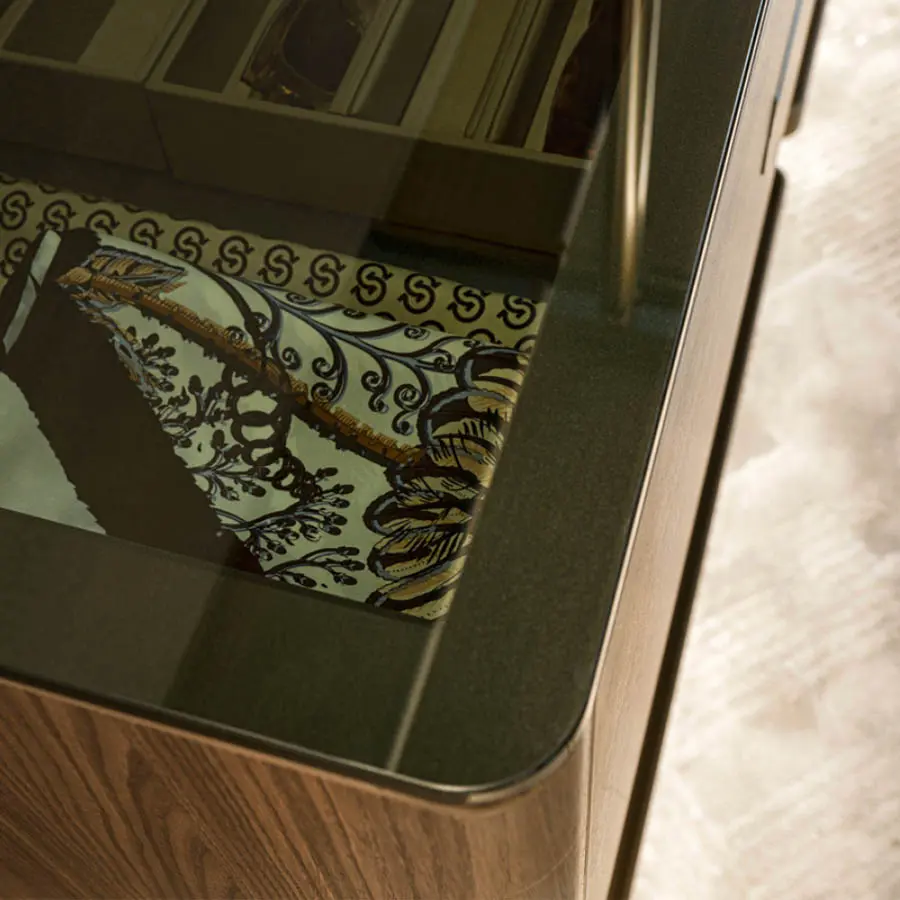 Hector Night se enriquece de funciones infinitas, permitiendo organizar libremente las composiciones suelo-pared o de pared. La peculiaridad del proyecto es el acabado metálico doble de la estructura en peltre y bronce, diseñada para combinarse perfectamente con los sofisticados materiales contrachapados castaño oscuro y claro de las cajoneras, y con el sobre de cristal tintado serigrafiado.