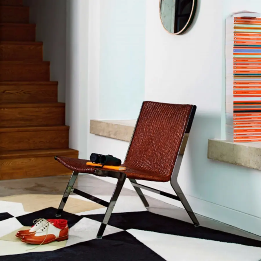 El sillón Helen posee indudablemente un fuerte carácter y una marcada personalidad, lo que le permite desempeñar un papel protagonista en cualquier estancia. Helen se caracteriza por una silueta sinuosa y presenta una estructura metálica de gran elegancia formal, fabricada en los acabados satinado, cromado, bruñido, cromado negro y champán. El corazón del proyecto radica en la elección del cuero, un material noble y precioso y especialmente querido en Flexform, que aquí se propone en un original pero sofisticado trenzado de espina hecho completamente a mano y disponibles en varios colores.