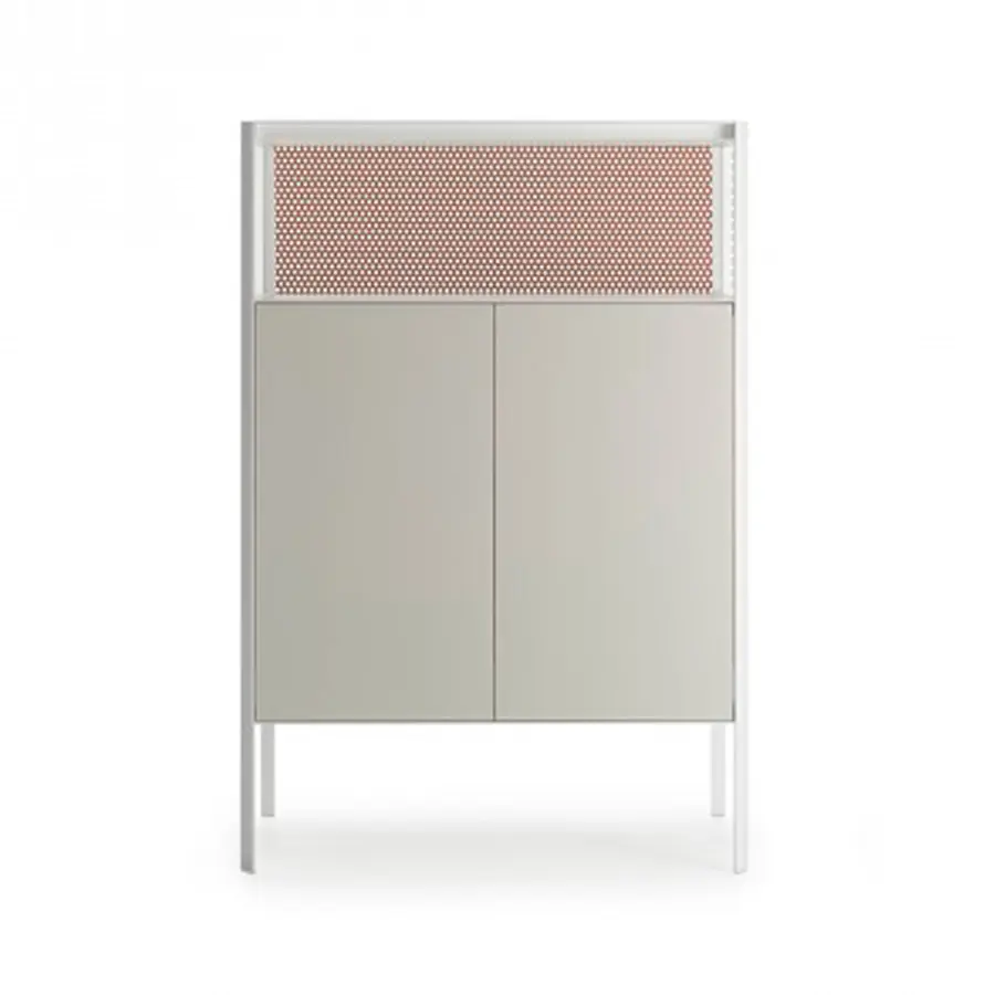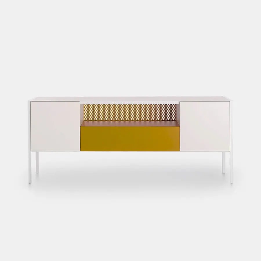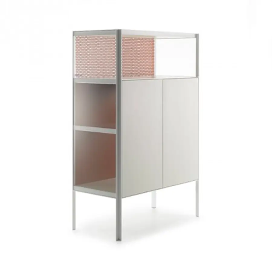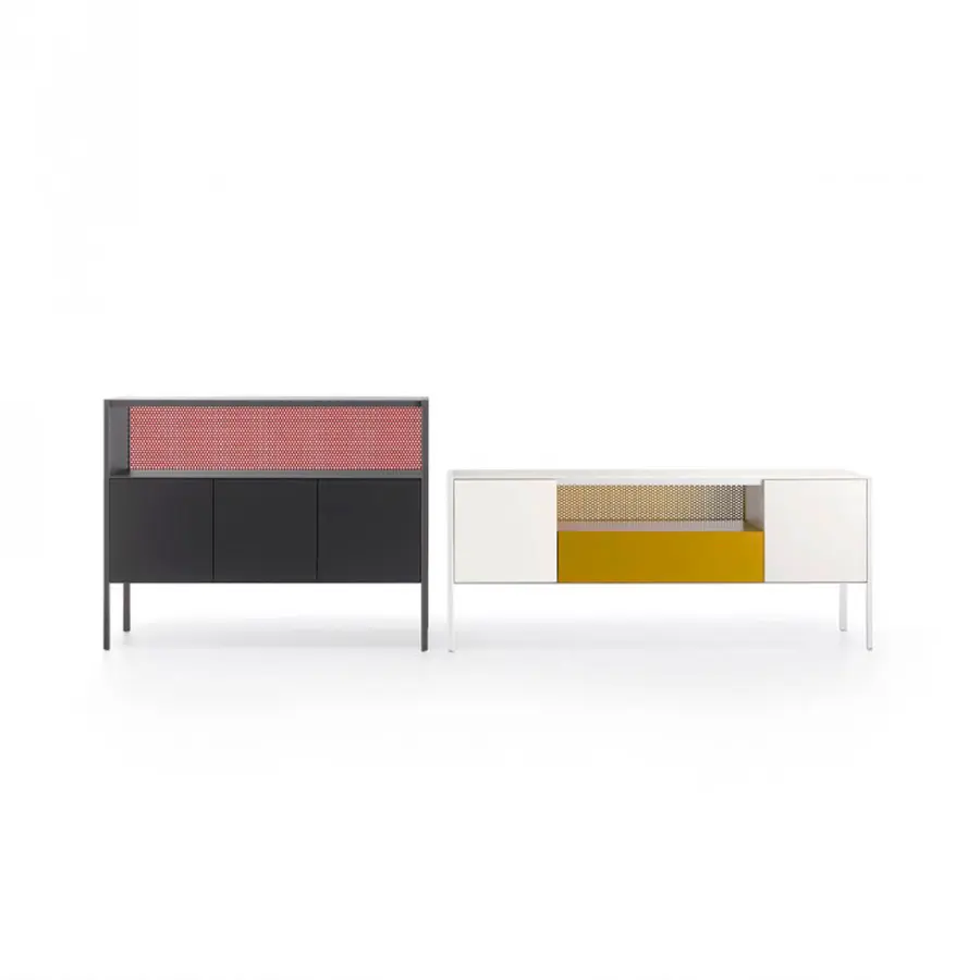 Sistema de unidades de almacenamiento con puertas, cajones y compartimentos abiertos para los diferentes entornos domésticos, de oficina y públicos. Colección compuesta por diferentes unidades de almacenamiento en términos de combinaciones dimensionales y equipamiento frontal.