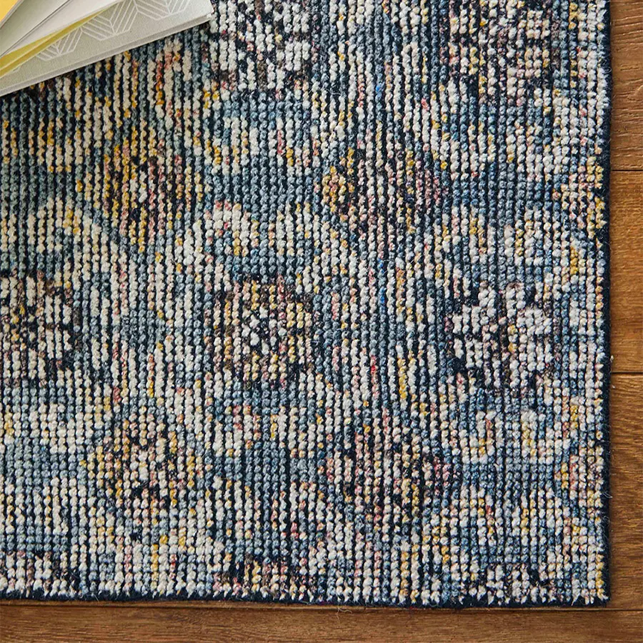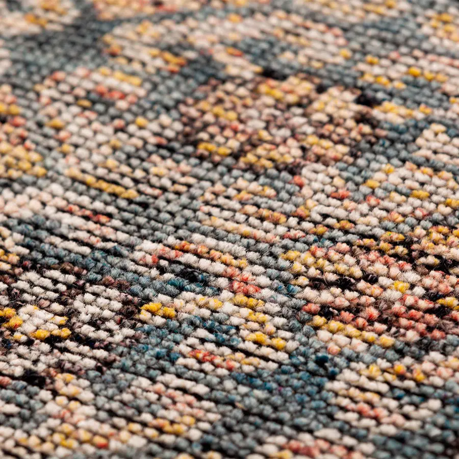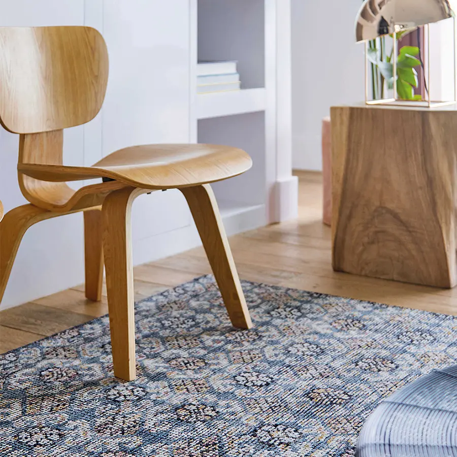 Esta es nuestra alfombra Hidraulic, un modelo inspirado en los patrones de dibujo de las baldosas de suelo hidráulico modernistas. Su superficie desvaída parece la de un auténtico pavimento antiguo que ha ido desgastándose con el tiempo. Es un diseño que se confecciona manualmente nudo a nudo con 100% lana virgen en un predominante color azul.