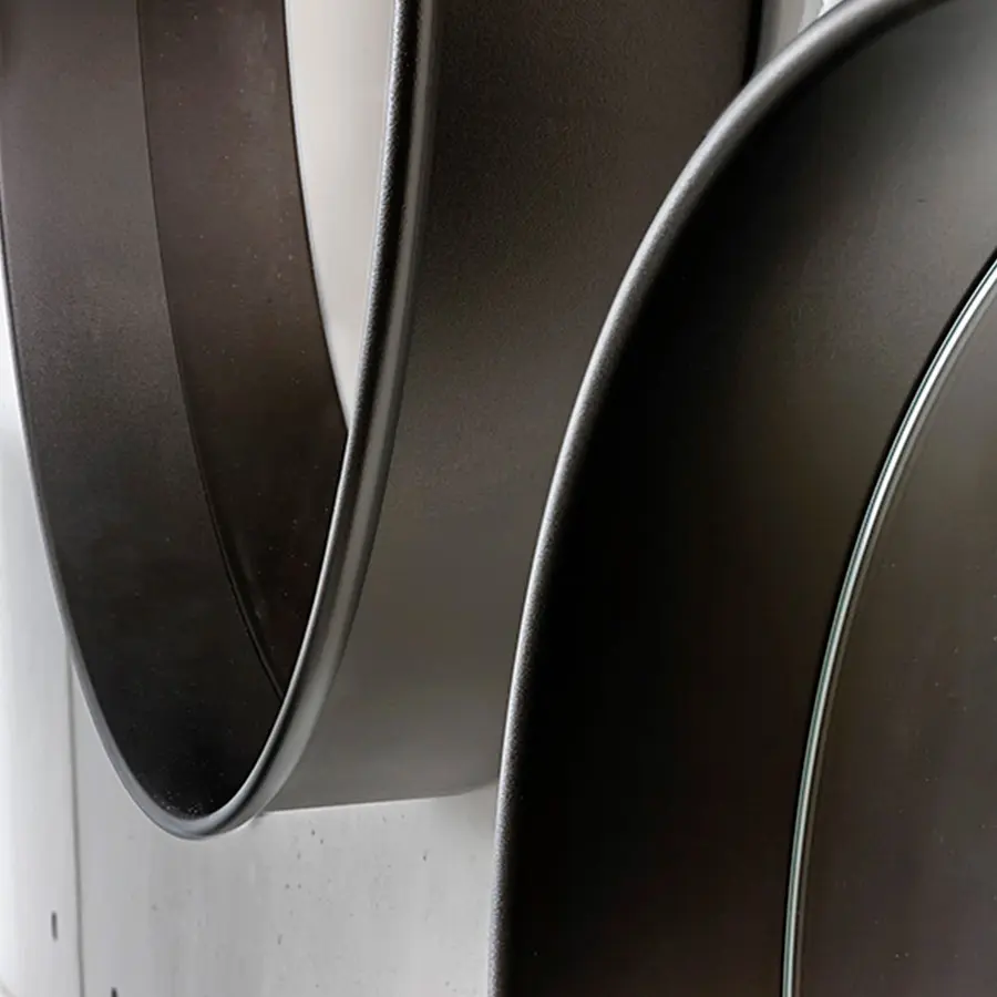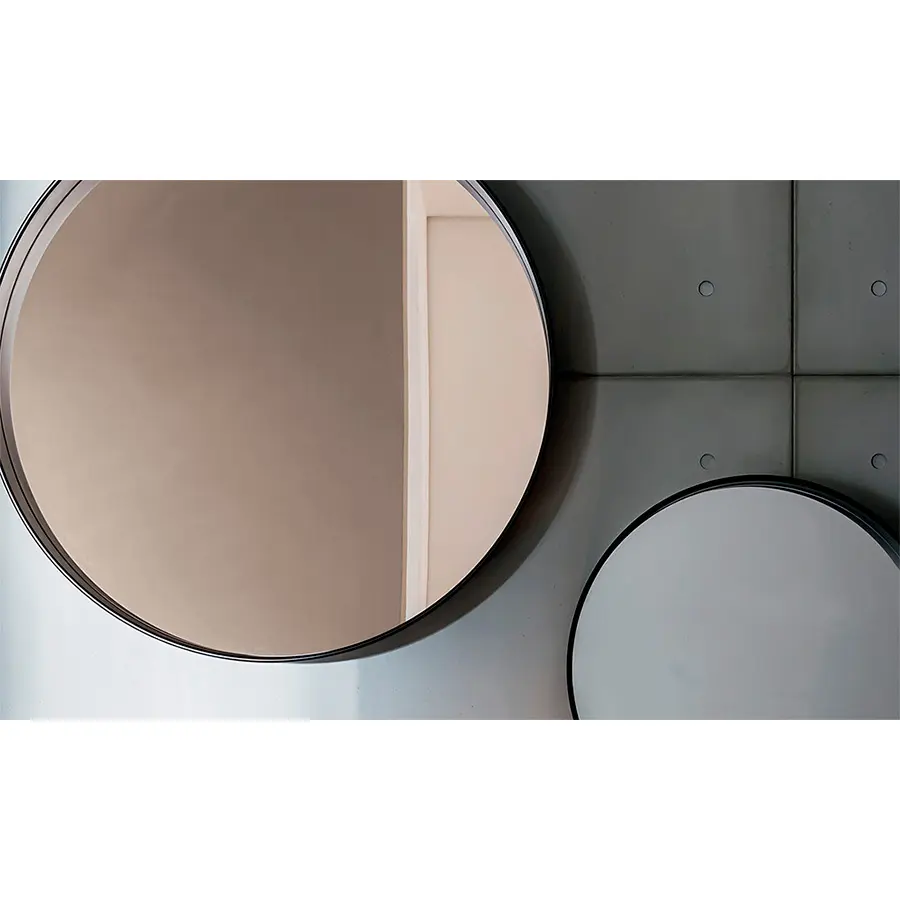 El espejo Horizon está bordeado por un marco de aluminio, caracterizado por una moldura delgada en el borde. La superficie reflectante también está disponible con un acabado esmerilado que dibuja una línea de horizonte, jugando con la luz y las proporciones. Los diferentes tamaños disponibles y la fijación giratoria de pared permiten crear diferentes composiciones. El marco está disponible en dos profundidades y en cuatro acabados lacados (café, arcilla, blanco y negro), para combinar con espejos con acabado plateado, ahumado o bronce. Una variedad que se presta para dar lugar a diversas soluciones, ampliando los horizontes del mobiliario del hogar y del espacio público.