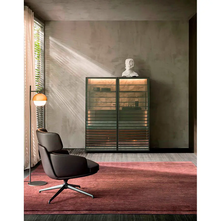 Dos puertas basculantes que, al cerrarse, revelan su contenido gracias al cristal stopsol transparente y la iluminación interna LED, o al abrirse – plegadas y adosadas a la estructura lateral permitiendo un acceso total al espacio interno – plasman un objeto que se transforma como un camaleón.