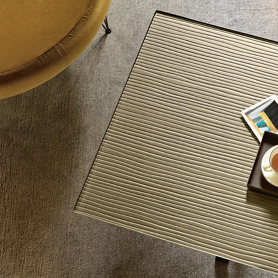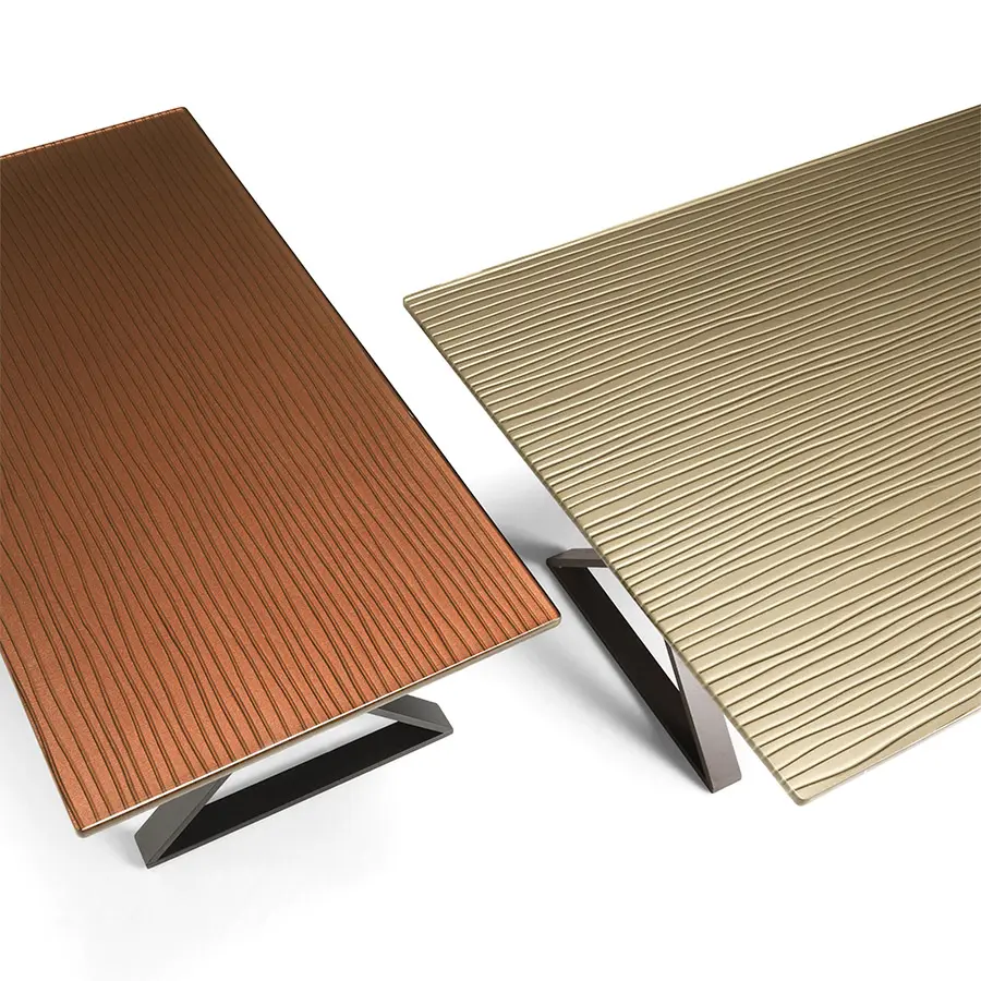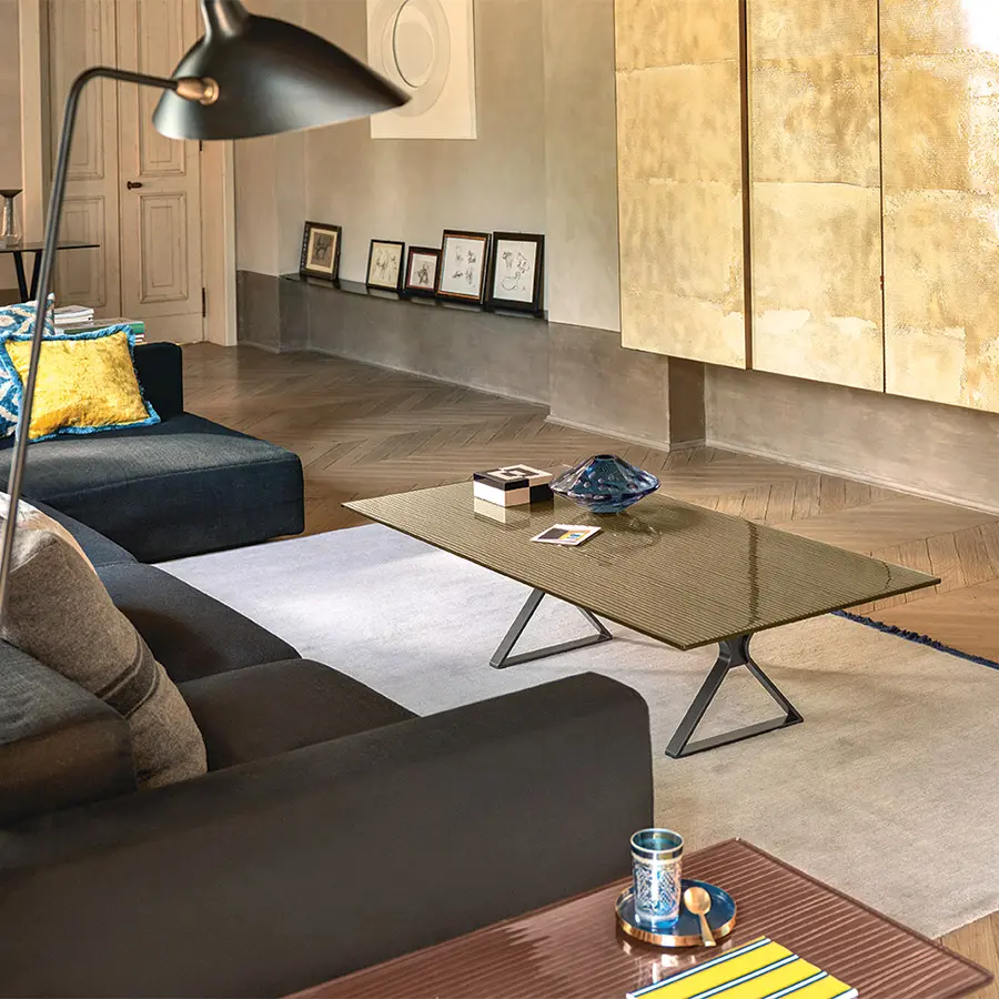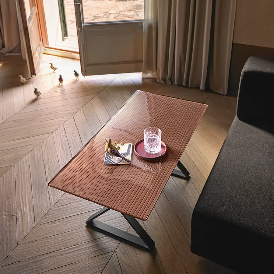 Mesa de centro con tapa de vidrio de 12 mm fundido a alta temperatura, templado y retrobarnizado con tonos metálicos de Gris Lava, Marrón Cobre o Champagne. Base en metal pintado, acabado Lava Grey.