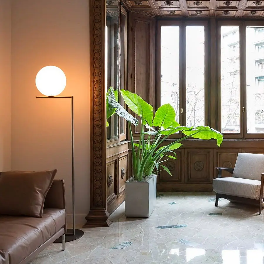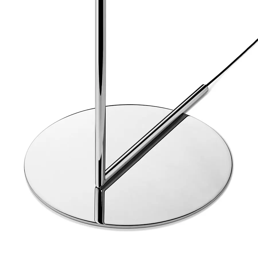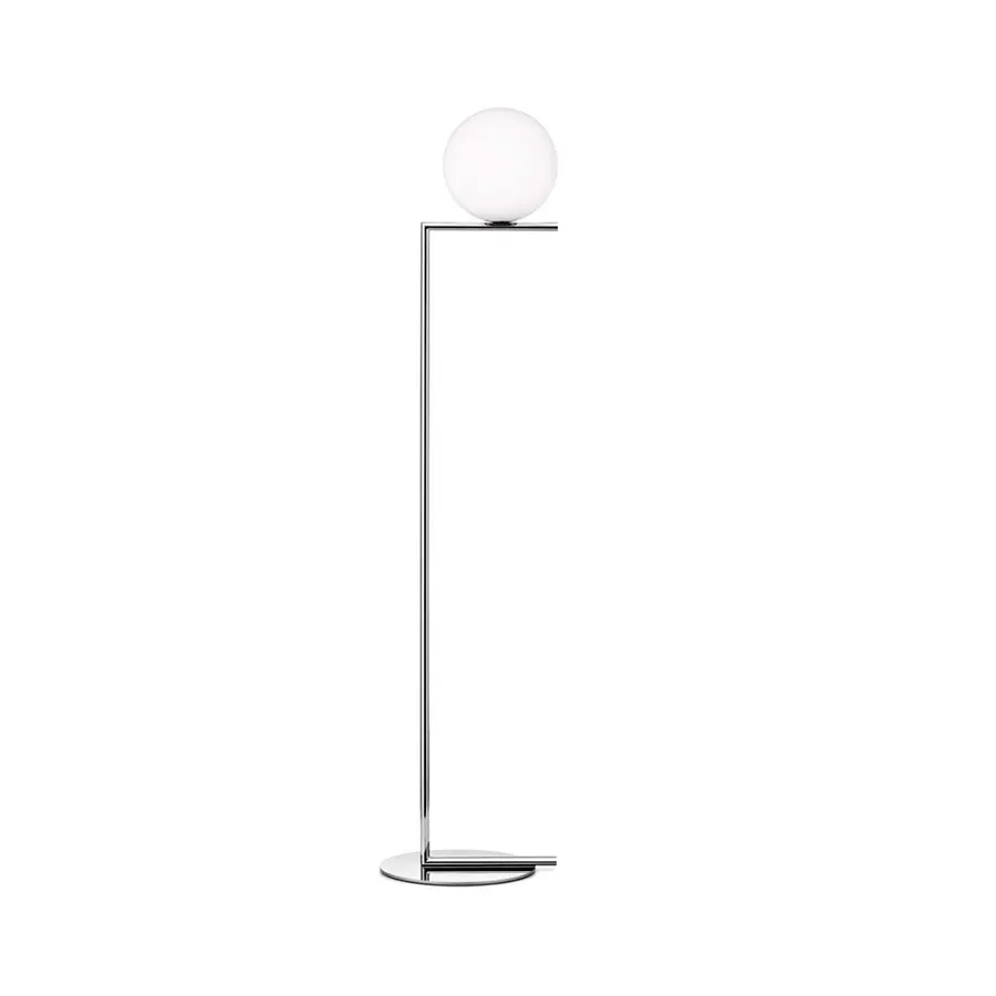 Lámpara de pie de luz difusa. Estructura de latón, cepillado y lacado transparente o acero cromado. Difusor opalino de vidrio soplado. Regulador de luz presente en el cable de alimentación