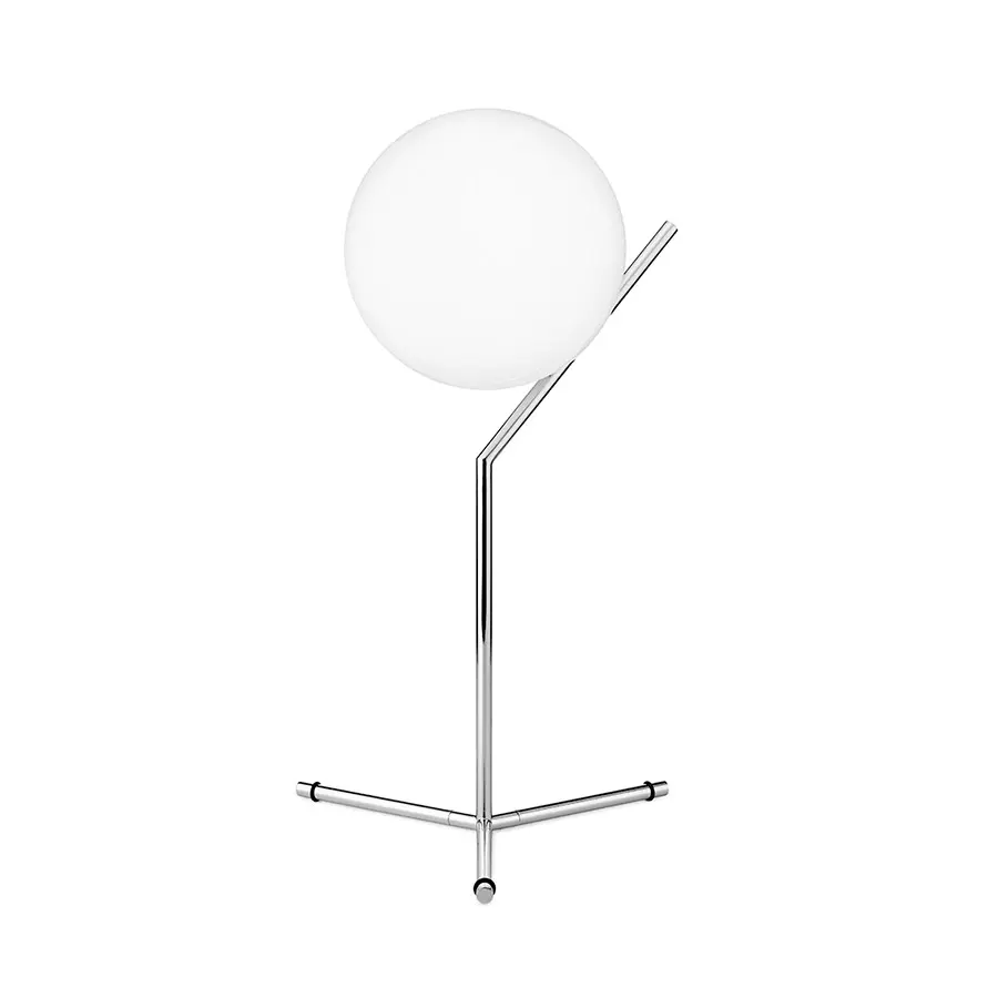 Lámpara de mesa con luz difusa. Estructura de latón, cepillado y lacado transparente o acero cromado. Difusor opalino de vidrio soplado. Regulador de luz presente en el cable de alimentación.