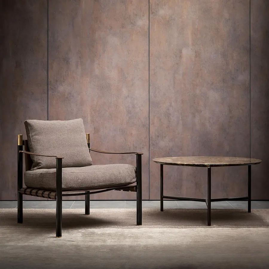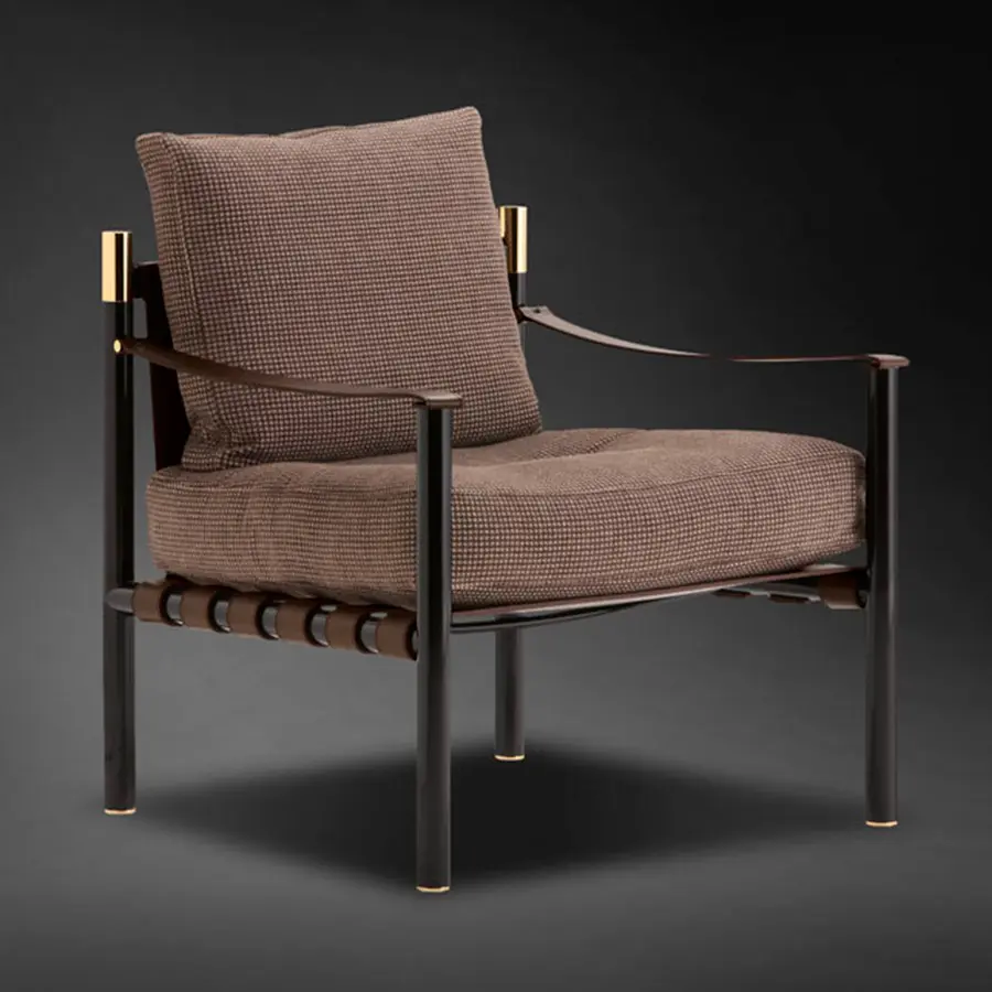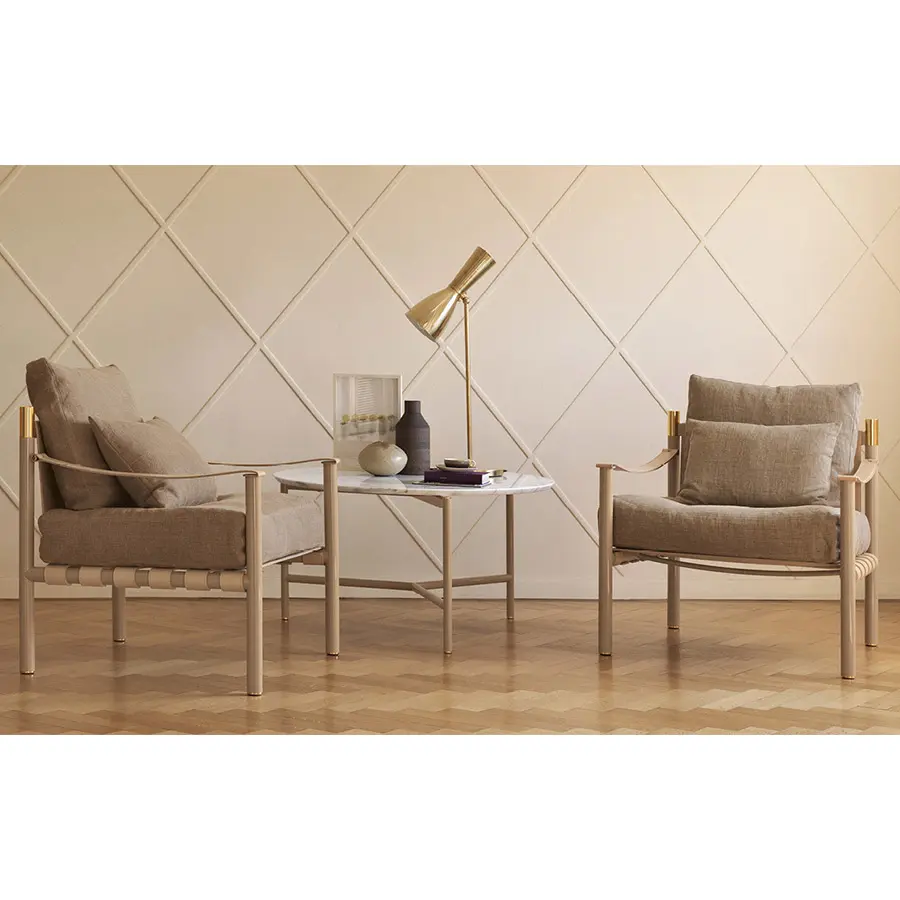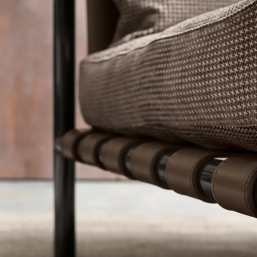Elegancia y armonía distinguen a esta butaca de alta clase que encaja fácilmente en ambientes tanto clásicos como contemporáneos. Los materiales preciosos, los detalles refinados y el asiento blando sugieren combinaciones con todo tipo de sofás, aunque también puede vivir otro tanto bien utilizada sola o en pareja. Estructura tubular de acero, disponible con acabados beige brillo y bruñido mate. Detalles de oro brillo o níquel negro brillante. Asiento y respaldo de cuero (no desenfundable), cojines para el asiento y para el respaldo con revestimiento desenfundable de tejido, piel o Ecopelle.