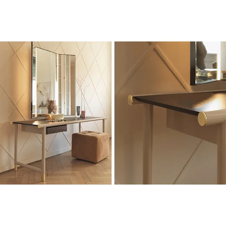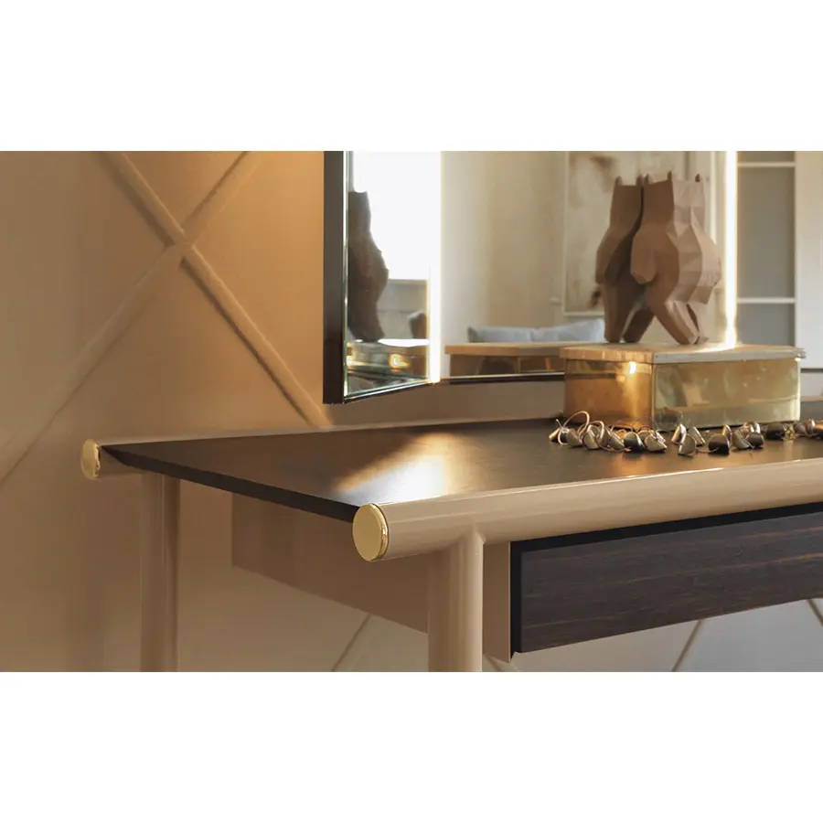 La estructura de la consola es en tubular de acero con acabados beige brillo o bruñido mate y detalles en oro brillo o níquel negro brillo.