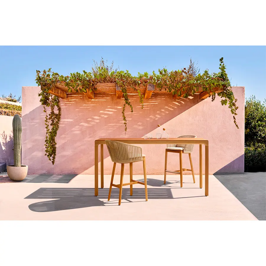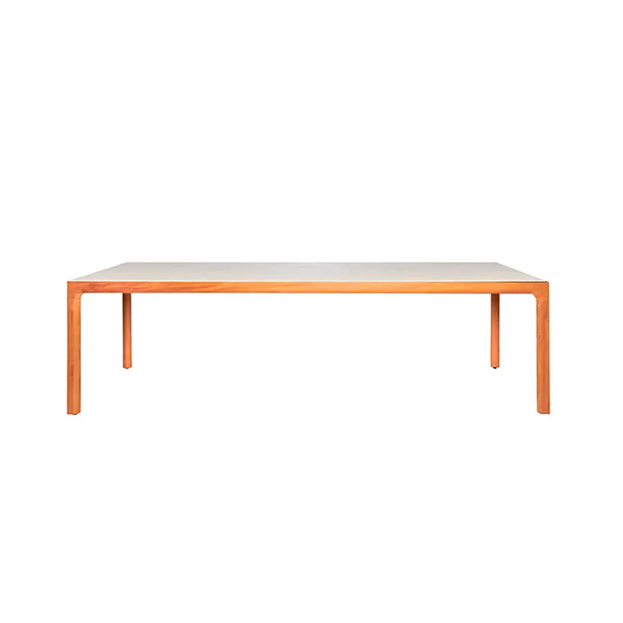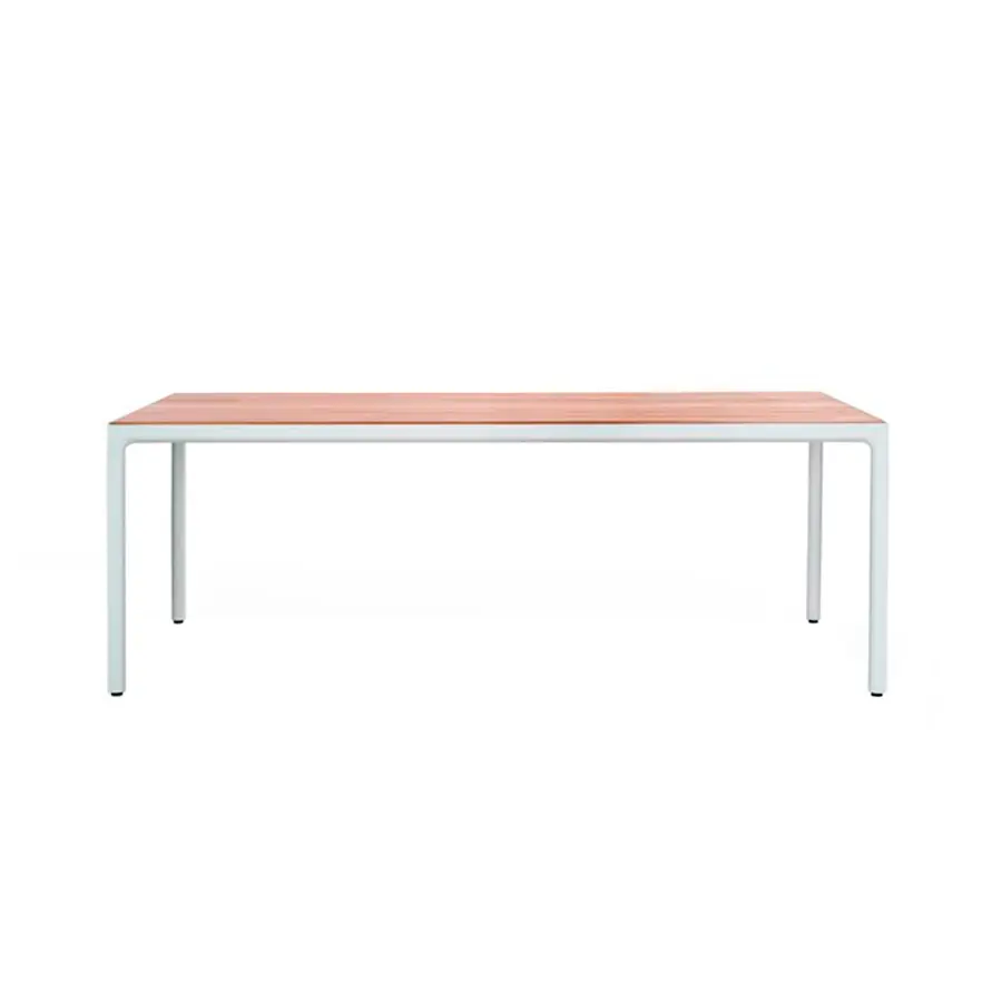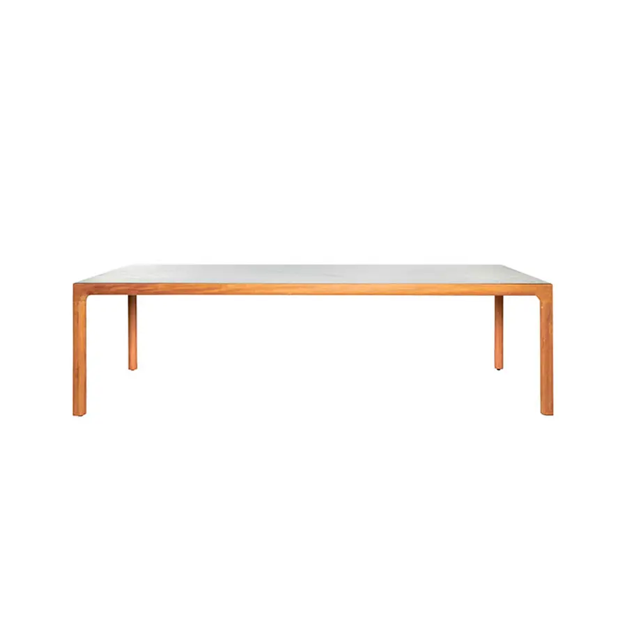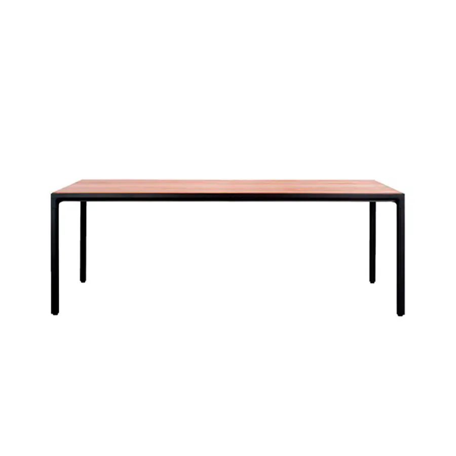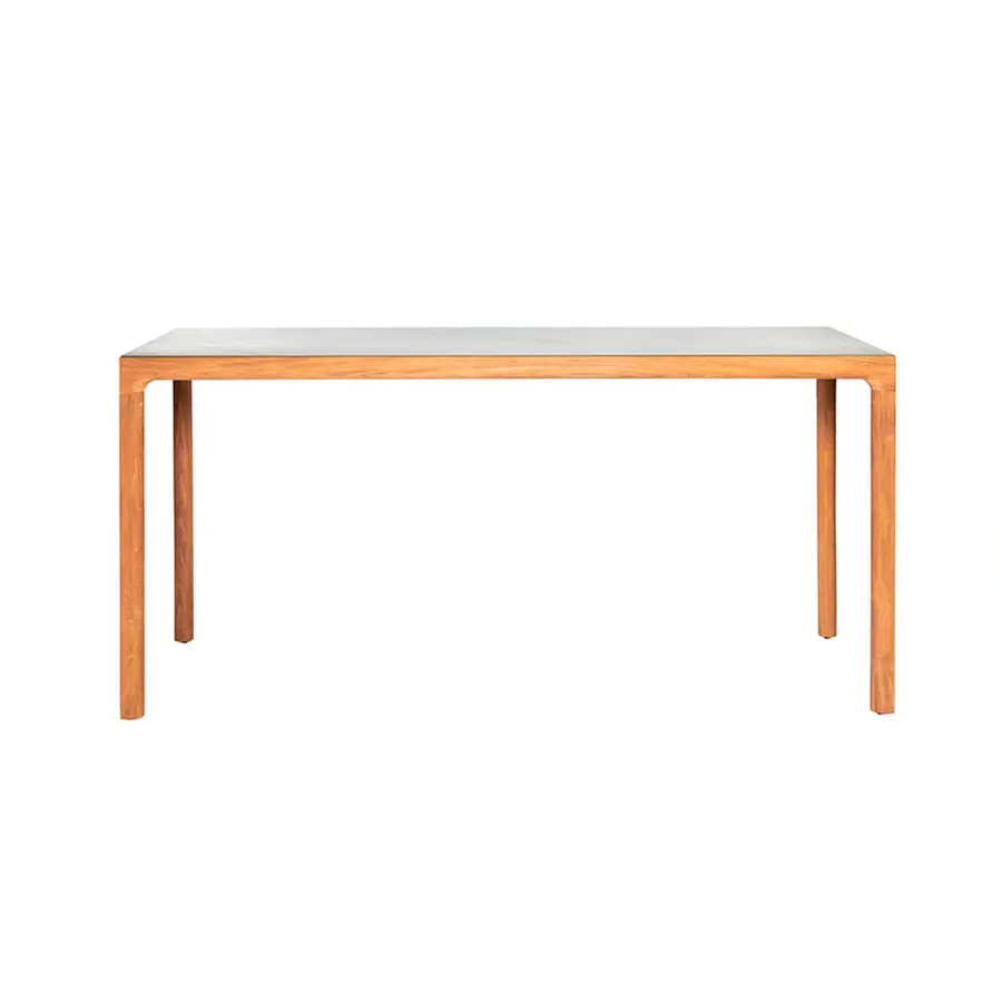 La mesa de comedor Illum en teca mantiene las esbeltas proporciones de la versión en aluminio pero está fabricada en teca de alta calidad procedente de plantaciones cuidadosamente gestionadas en Java Oriental. El tablero de la mesa se conecta con las patas mediante una única y suave curva. Las esquinas están fabricadas a partir de una pieza de madera maciza, esculpidas a mano y lijadas para dejar a la vista la belleza natural de la teca. Esta mesa Illum no tiene bordes muy marcados, se han redondeado para conseguir un aspecto y un tacto suaves y agradables. Además, el tablero superior está disponible en teca o cerámica.