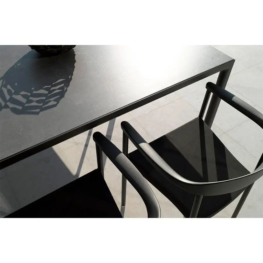 El suave respaldo curvado ofrece una vista acogedora y cómoda. El asiento está realizado en Batyline con un sutil tejido.Una elección que favorece tanto al aspecto como la durabilidad del Batyline porque es sumamente fuerte, resistente a los rayos UV, de secado rápido y repele a la suciedad y a la humedad.