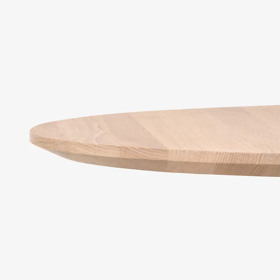La mesa está construida de madera maciza y tratada con laca o aceite. La base central está hecha de metal negro mate.
