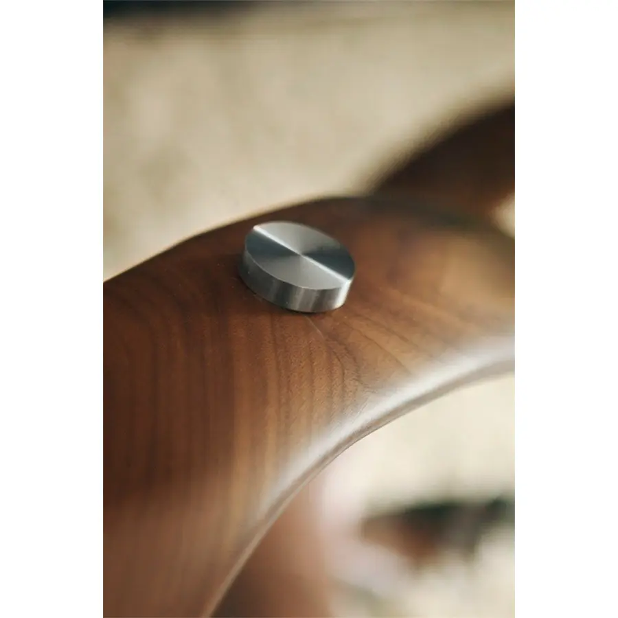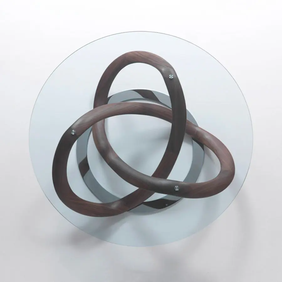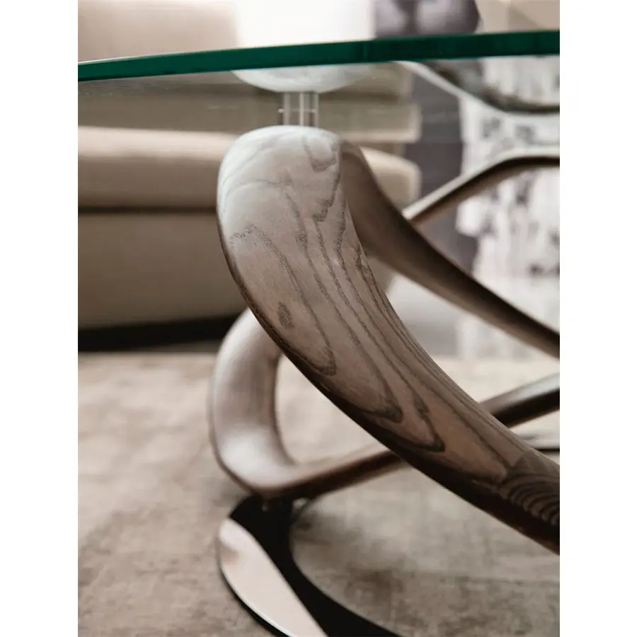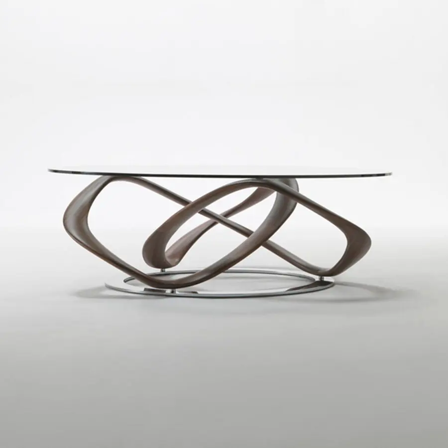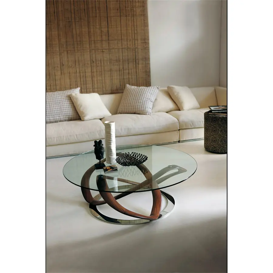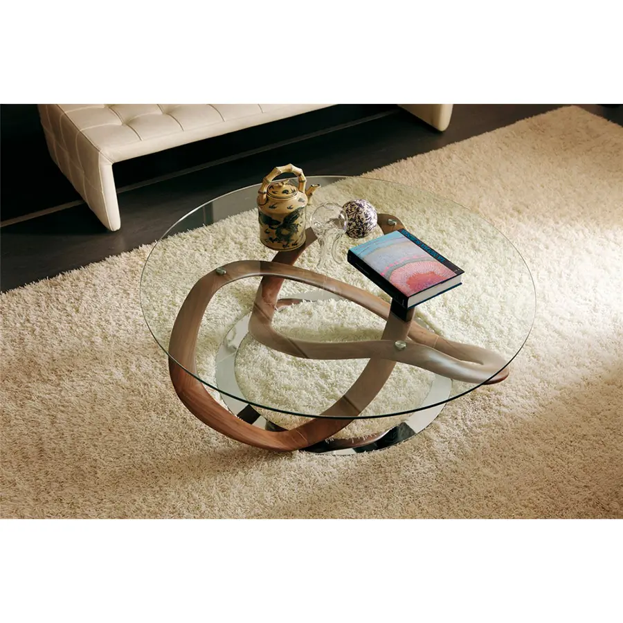 Mesa de centro con tapa en cristal templado (espesor mm.10) y estructura en nogal canaletta o fresno macizo, fijada sobre de un disco de metal cromado.