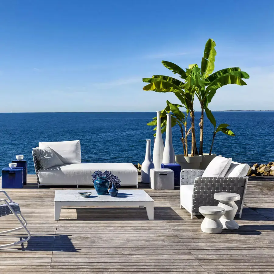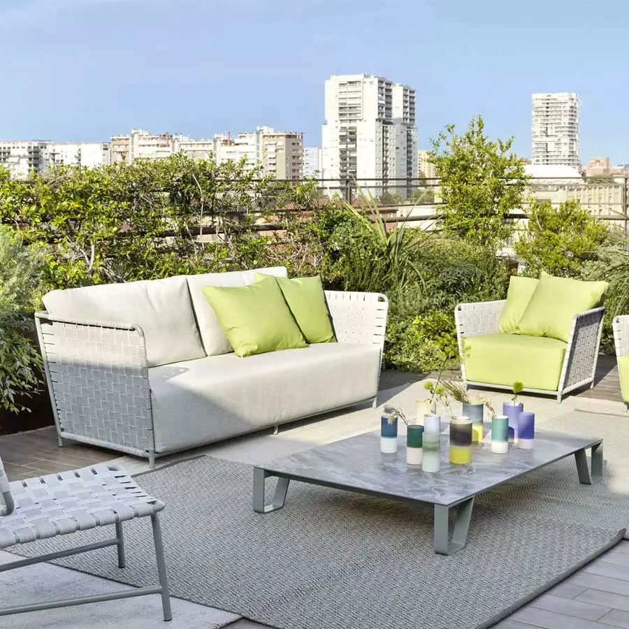 Un sofá que se desarrolla en torno a una ligera estructura tubular de aluminio pintado de blanco, gris o salvia, material ecológico y único por sus cualidades técnicas. A esto se agrega un particular entramado de cintas elásticas de color gris, negro o azul, un producto innovador a base de goma sintética y propileno. Finalmente, gruesos cojines de asiento y sueltos de poliuretano expandido con fundas extraíbles aumentan el confort de los productos.