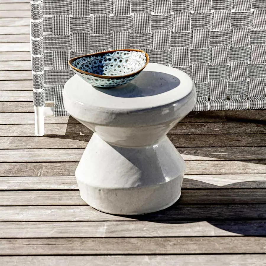 Familia de mesas de centro-pufs de hormigón GFRC blanco o gris antracita, las Inout 47/48/49 se distinguen por su carácter esencial: disponibles en diferentes alturas, tienen una estructura de tótem asimétrica, con tablero redondo, para dar origen a productos de sofisticada esencialidad.