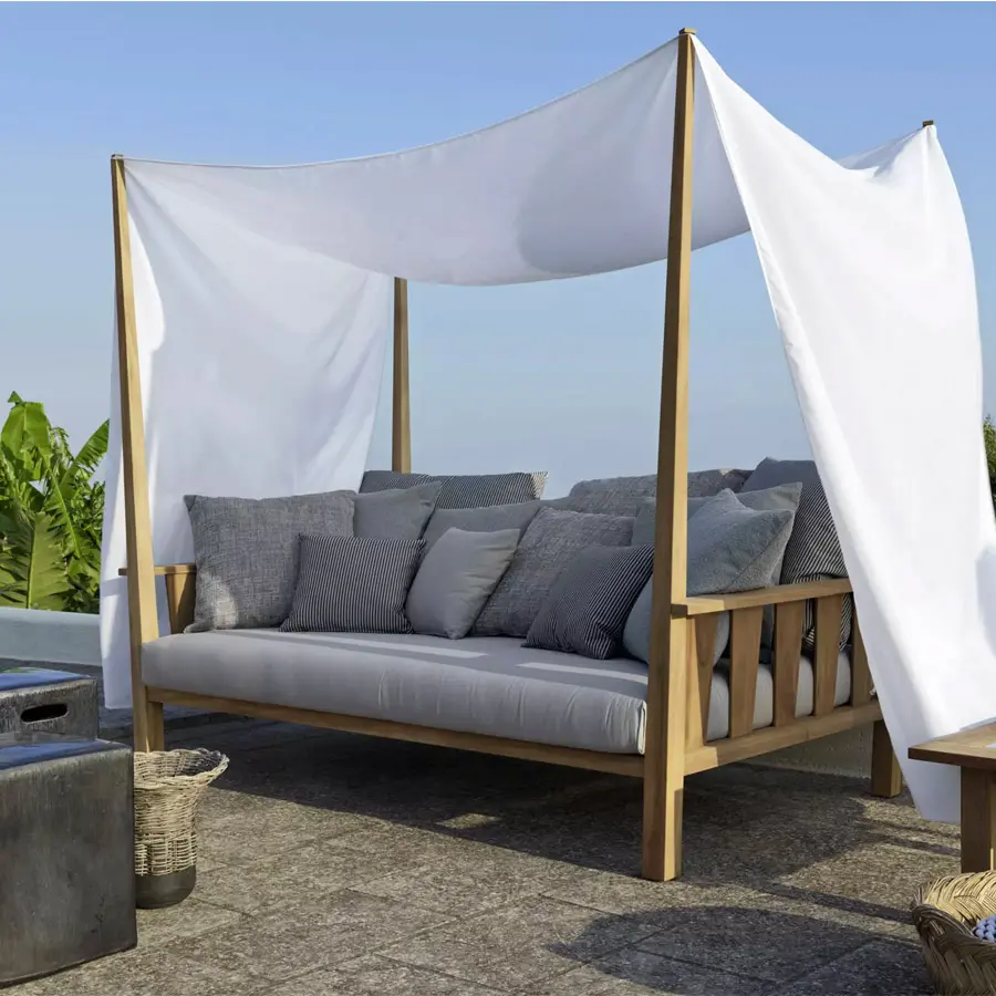 Sofá con dosel de inspiración exótica, el Inout 07 tiene una estructura realizada en teca, material proveniente de la reutilización de vigas y elementos de teca recuperados, reparados con madera reciclada, ensamblados y lijados para dejar a la vista las vetas originales. Se caracteriza por un asiento amplio, con cojín desenfundable, al que se pueden agregar cojines sueltos para aumentar el confort. De las cuatro esquinas del sofá surgen 4 columnas de madera que forman el dosel, sobre el cual se extiende una cortina blanca para mayor privacidad e intimidad.