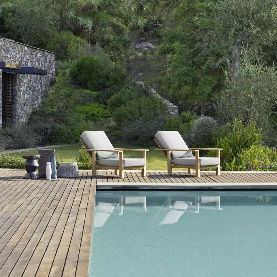 Sillón reclinable caracterizado por influencias exóticas y elementos de sofisticada esencialidad, el Inout 09 está realizado en teca natural, material reciclado y proveniente de la reutilización de vigas de teca, perfecto para resistir a las condiciones meteorológicas. Tiene una estética limpia y minimalista, con una marcada suavidad gracias al agregado de cojines sueltos desenfundables de asiento y respaldo, con pasamanería color blanco/gris en contraste.