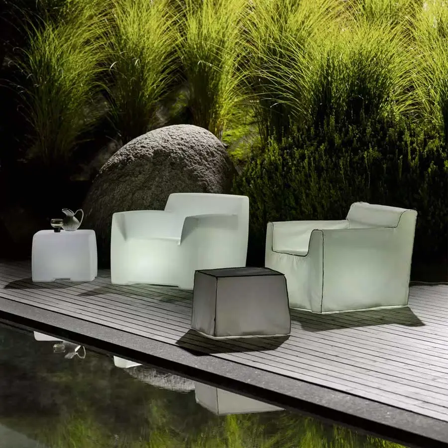 The Inout 108/108L coffee table-pouf is made of opal white polyethylene: it can be illuminated as if by magic and give a touch of charm to summer nights. It is also available with a removable cover finished with French seams for a version with softer lines.