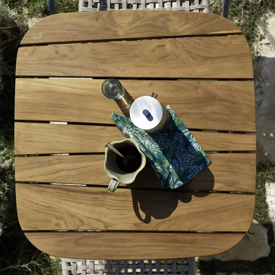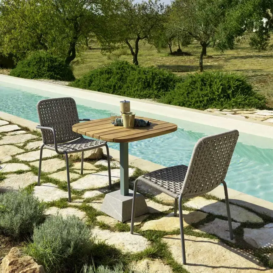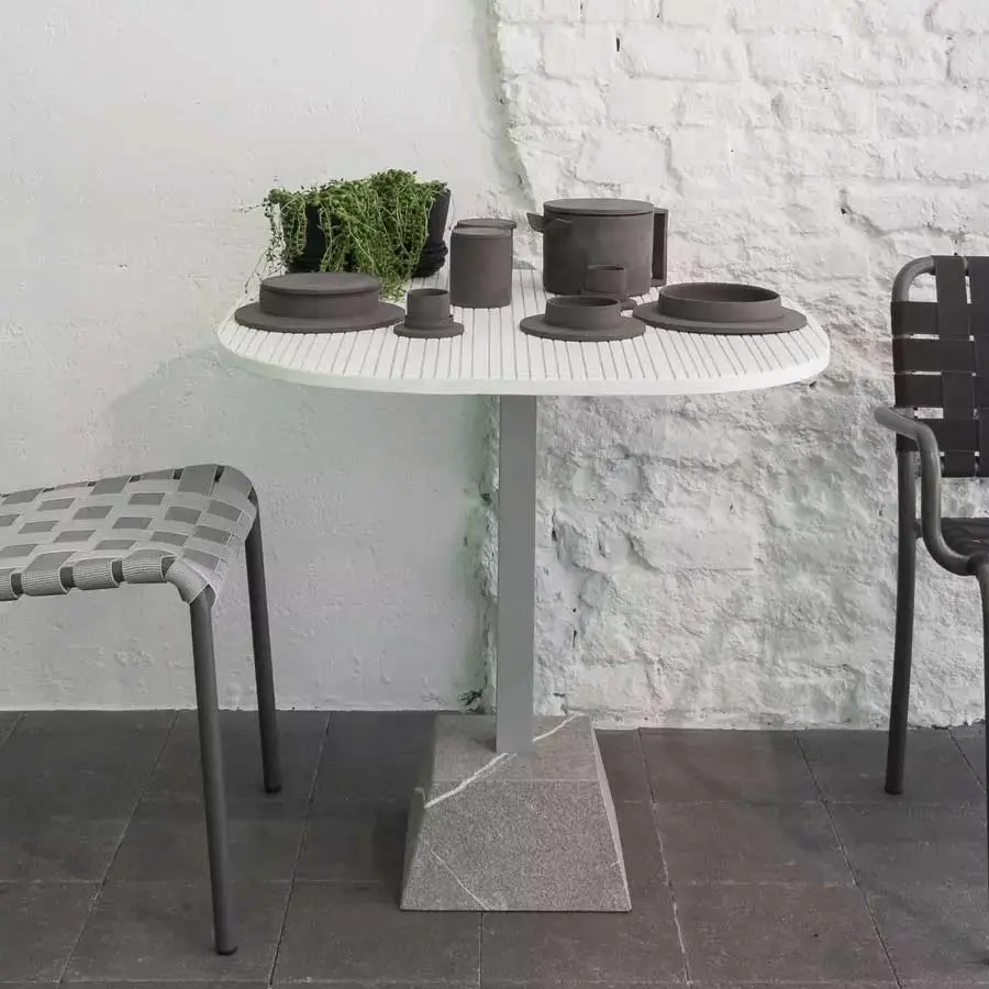 Un diseño limpio define a la mesa de centro Inout 137: realizada con base de piedra Piasentina flameada, combina el aluminio pintado de blanco mate, gris o salvia de la columna central, con el tablero cuadrado disponible en duelas de teca natural, en mármol blanco de Carrara, en cemento con efecto mosaico y en gres porcelánico gris, para un producto de extremada versatilidad.