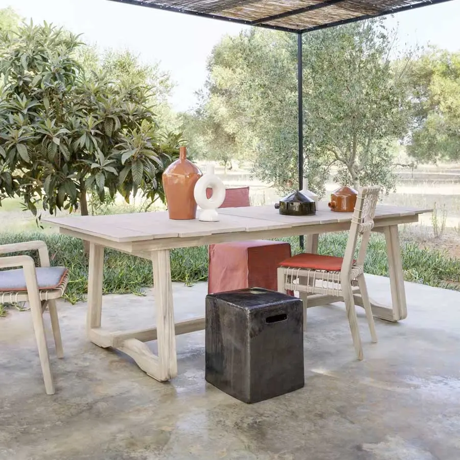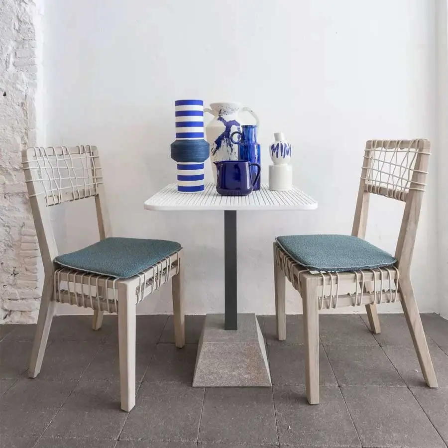 La refinada esencialidad nórdica define a la silla Inout 865. Tiene la estructura de teca lavada, una de las maderas tropicales más preciadas, sometida a tratamiento de envejecimiento que determina el particular tono gris de la superficie, lo que da a los productos un delicado atractivo. A esto se une un especial tejido de malla hecho de cuerda de polietileno de alta intensidad, que brinda un atractivo artesanal al producto.