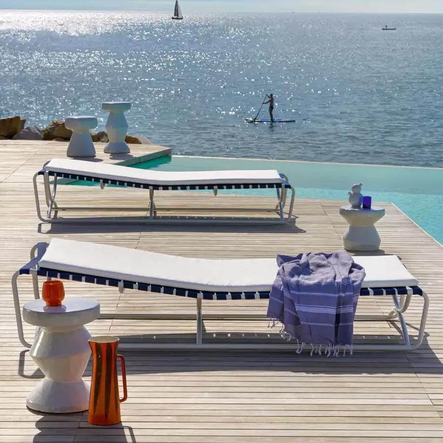 La tumbona Inout 884 se caracteriza por una estructura fija, no reclinable, de aluminio pintado de blanco mate, gris o salvia. La estructura está embellecida por un entramado de cinta elástica en azul, negro o gris, sobre el cual es posible colocar una colchoneta desenfundable para lograr mayor suavidad.