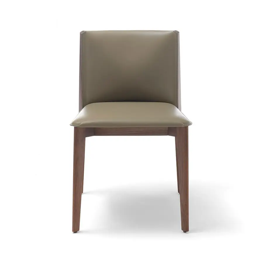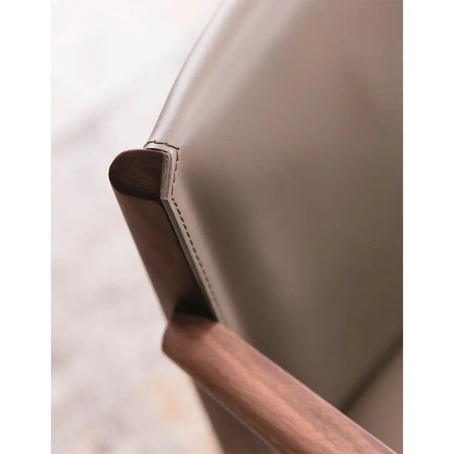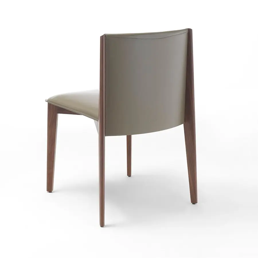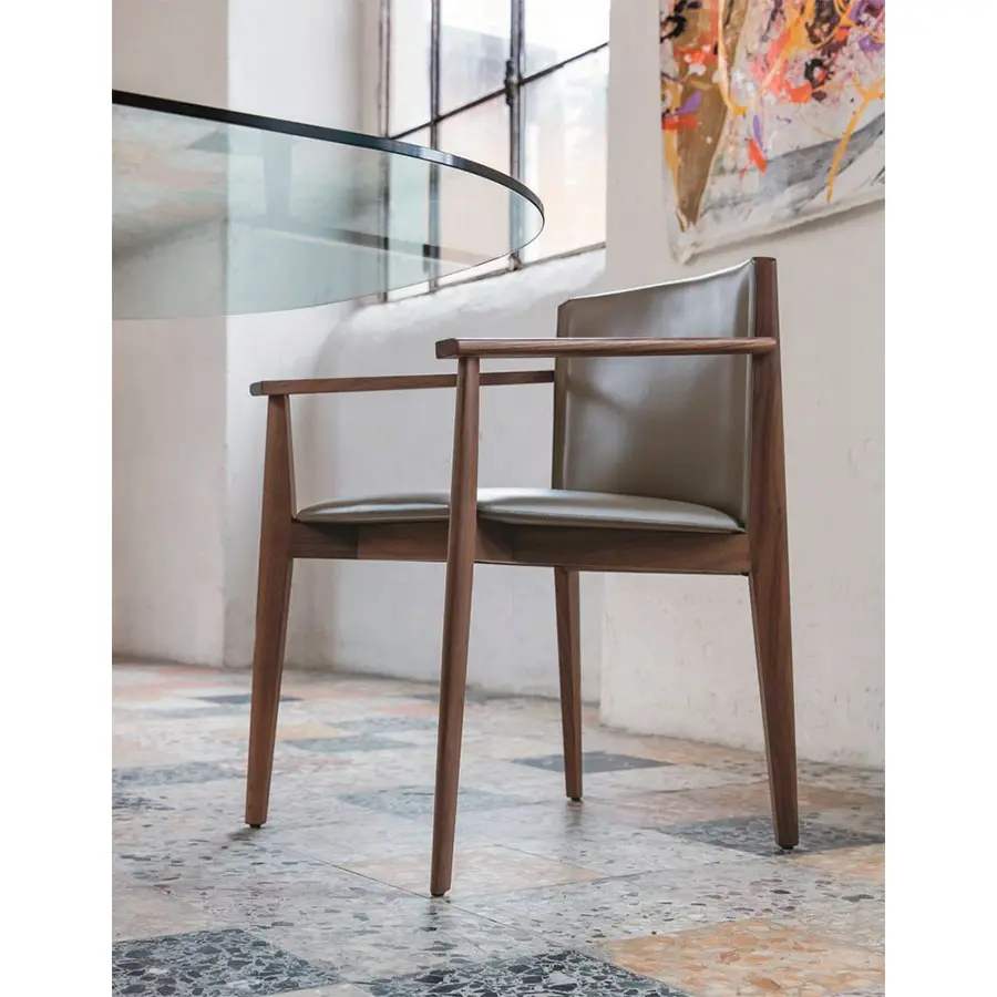 Silla de comedor con estructura de nogal maciza y asiento revestido en cuero. Puede ser con o sin brazos.