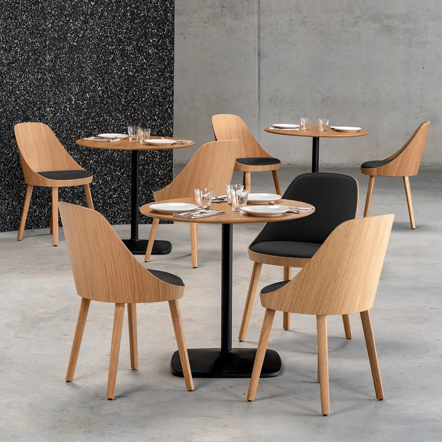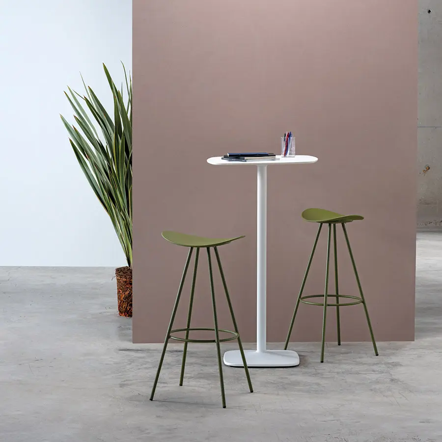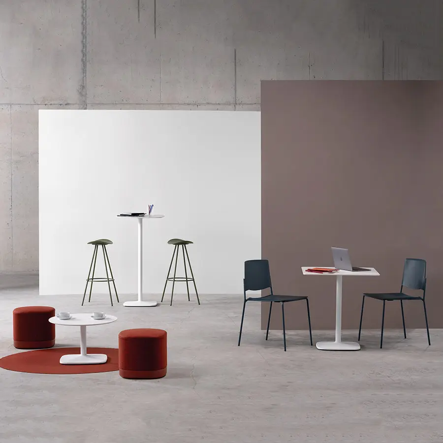 La mesa Iron cuenta con una estructura de acero lacada en cualquiera de nuestros colores que proporciona una gran estabilidad. Con diversas alturas, acabados y formas de tablero, es perfecta para cafeterías, bares, restaurantes y hoteles, aunque también es adecuada para entornos más corporativos.