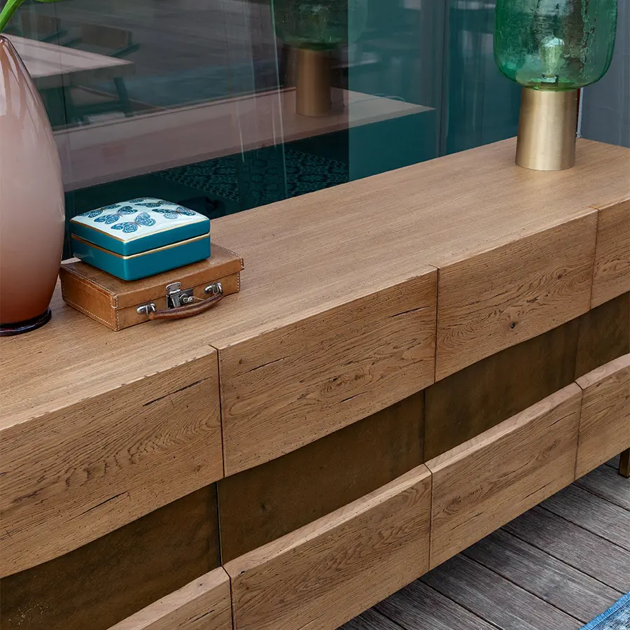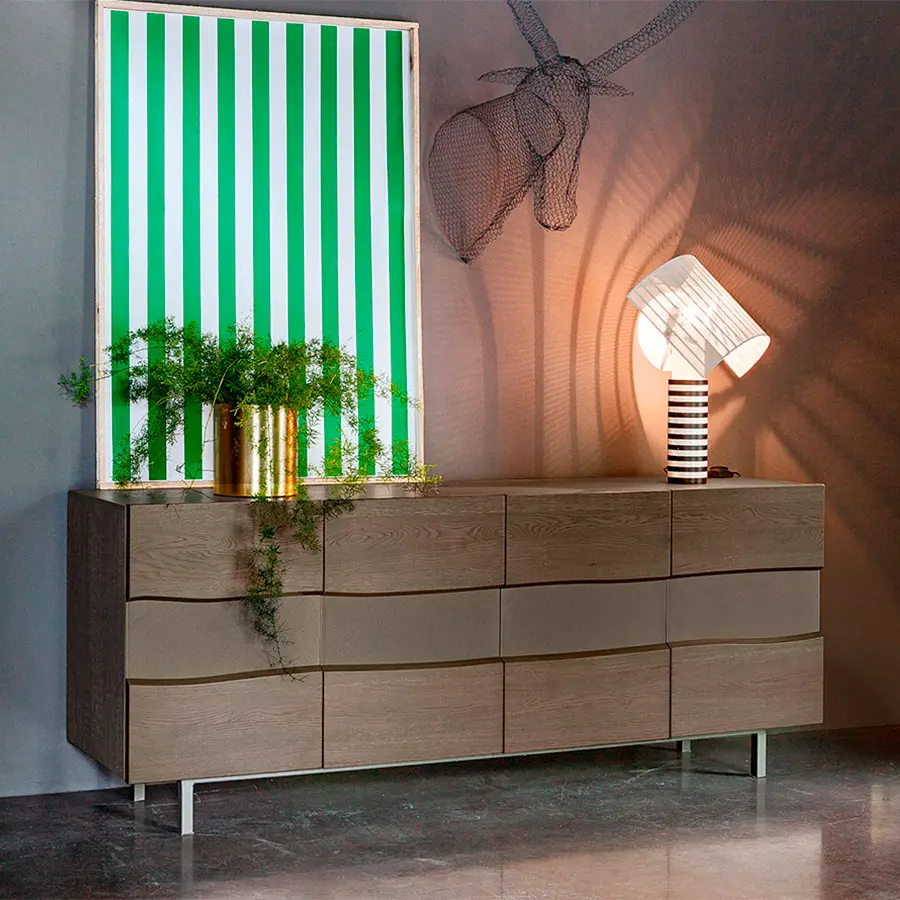 La parte frontal del aparador Iron Twins se basa en la alternancia de diseños y materiales.