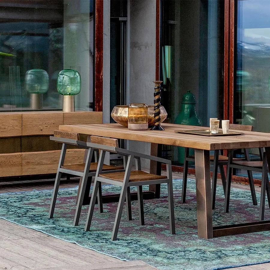Las bandas de puertas en madera maciza de roble, se cruzan con un inserto de hierro que se convierte en el punto focal del mueble. Podemos elegir entre más de 30 colores disponibles, desde colores naturales hasta los tonos más eclécticos, para darle la máxima creatividad y hacer una pieza personalizada y única.