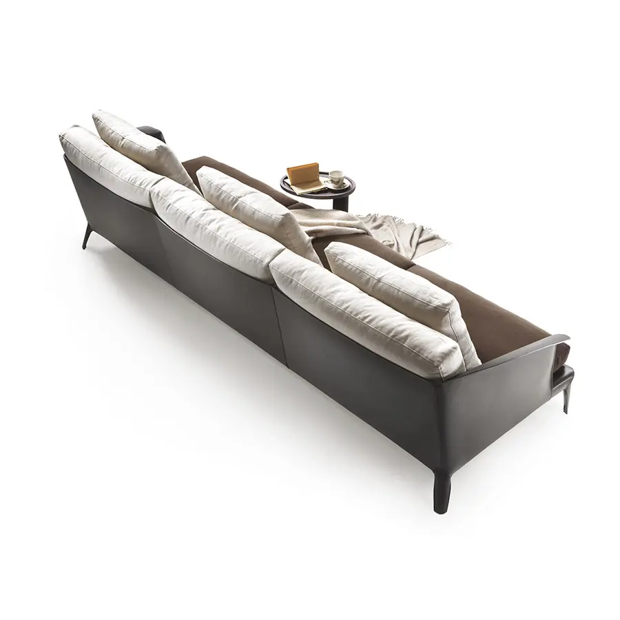 Un sofá en el que el proyecto está dictado por la expresividad intrínseca de un material noble y versátil como el cuero. El sofá Isabel aúna a la riqueza de los contenidos y la confección una línea esbelta y esencial. El respaldo está conformado por una carcasa metálica completamente recubierta en cuero que se extiende hasta los reposabrazos que, abriéndose ligeramente en los extremos, crean un ligero pliegue en el cuero, que recuerda el arte japonés del origami. El sofá Isabel se caracteriza por una elegancia suave y se puede realizar en cuero, tejido o piel seleccionados en tonos lisos o en contraste, para revelar un carácter más decidido.
