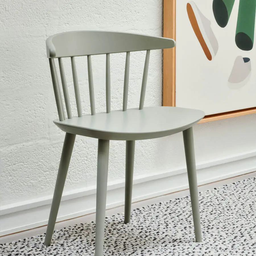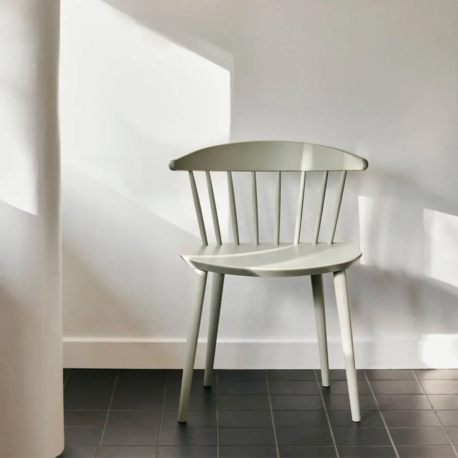 La silla J104 destaca por su respaldo curvo que se adapta perfectamente a la espalda. Diseñada por Poul M. Volther para Hay, esta silla cuenta con distintas versiones y acabados. Disponible con cojín en el asiento, respaldo alto o brazos.