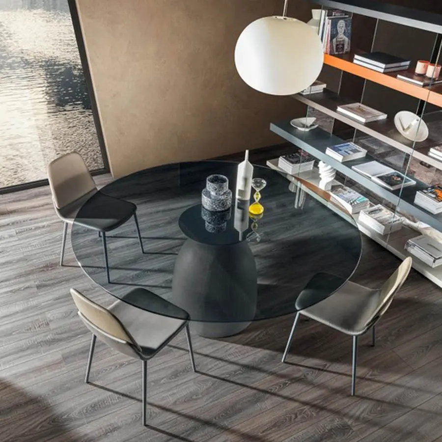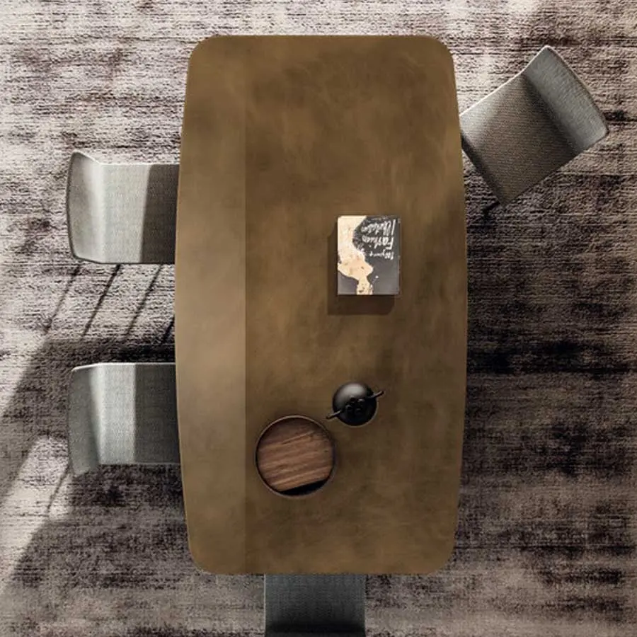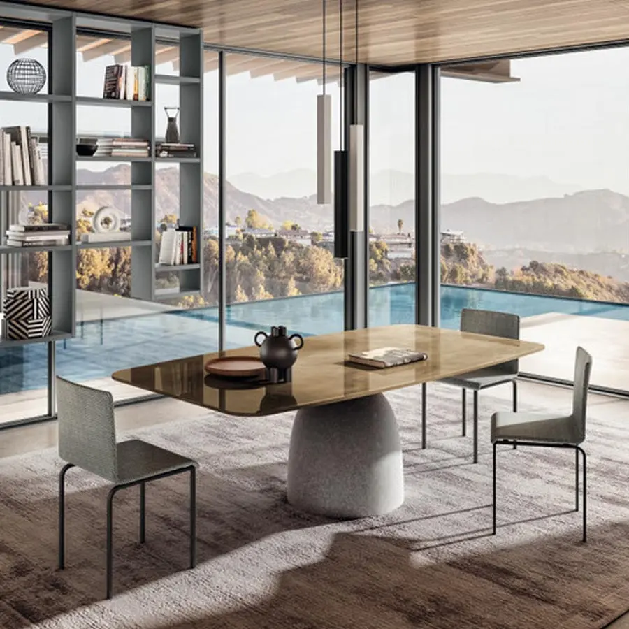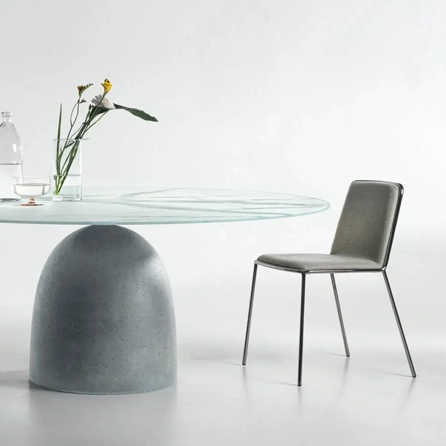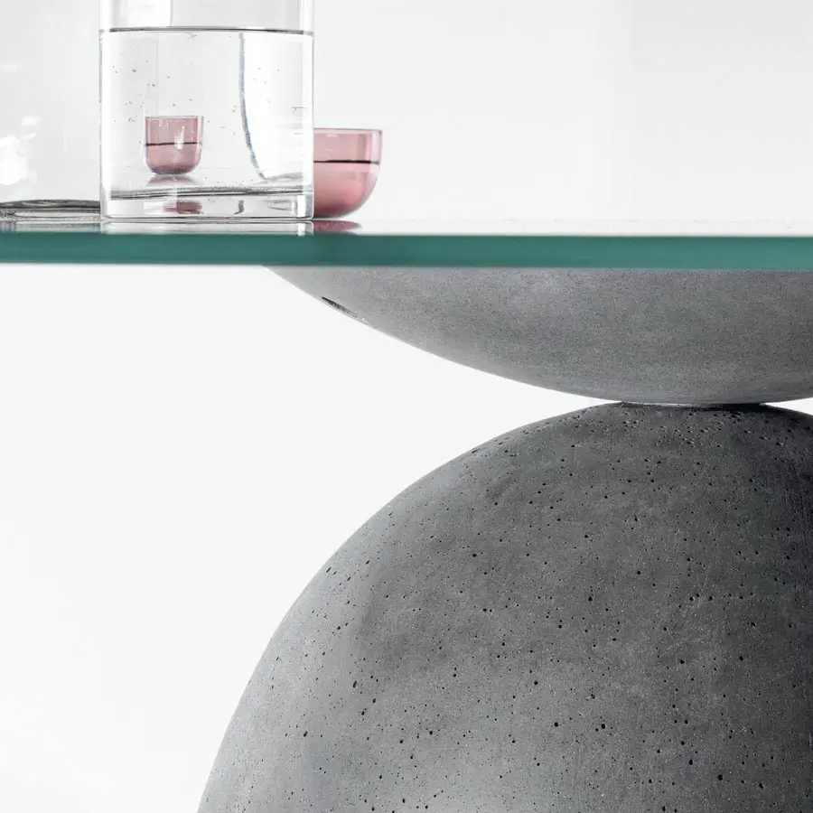 La línea de un sólido rocoso ha inspirado el diseño de la mesa Janeiro. La forma característica del bloque de cemento que conforma la base evoca el famoso promontorio brasileño, el «Pan de Azúcar» de Río de Janeiro. La base de la mesa en efecto juega con dos sólidos en forma de cúpula, en equilibrio entre sí, mientras que el tablero de la mesa parece estar mágicamente en equilibrio sobre la cima de la base. La propuesta sencilla y matérica del cemento abraza perfectamente las líneas blandas de la base y del tablero disponible en forma circular, abarrilada o rectangular.