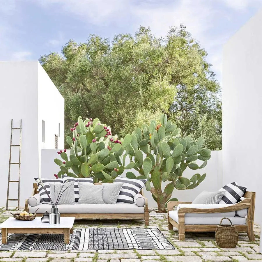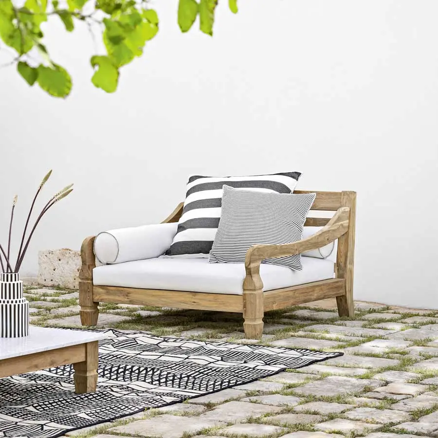 Sillones de estilo colonial de inspiración exótica, los Jeko 01/05 tienen una estructura realizada en EcoTeak, material proveniente de la reutilización de vigas y elementos de teca recuperados, reparados con madera reciclada, ensamblados y lijados para dejar a la vista las vetas originales. Se caracterizan por un asiento amplio y bajo, con cojín desenfundable al que se pueden agregar cojines sueltos para aumentar el confort.