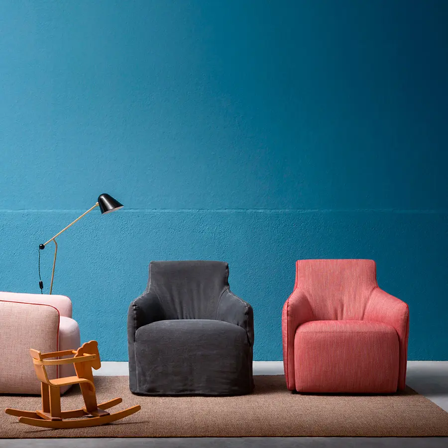 Jet Set es un sillón tapizado y desenfundable (en las versiones de tejido y eco-piel), disponible en las variantes con patas, con base giratoria y con faldón. Este sillón se caracteriza por sus suaves líneas resaltadas por un ribete en contraste. El cómodo reposa-pies es su complemento ideal.