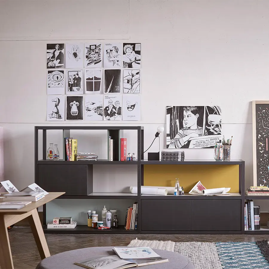 For the design of the Kai collection, we have collaborated with the prestigious French designer Jean Louis Iratzoki. Together we have created a system characterized by the combination of solid wood with different materials such as colored lacquers, felt, and even marble. That is to say, noble and quality materials are combined with fresher and more current materials. The personality of each piece emerged from the elements used to configure it: more open or more functional versions, more colorful or soberer…