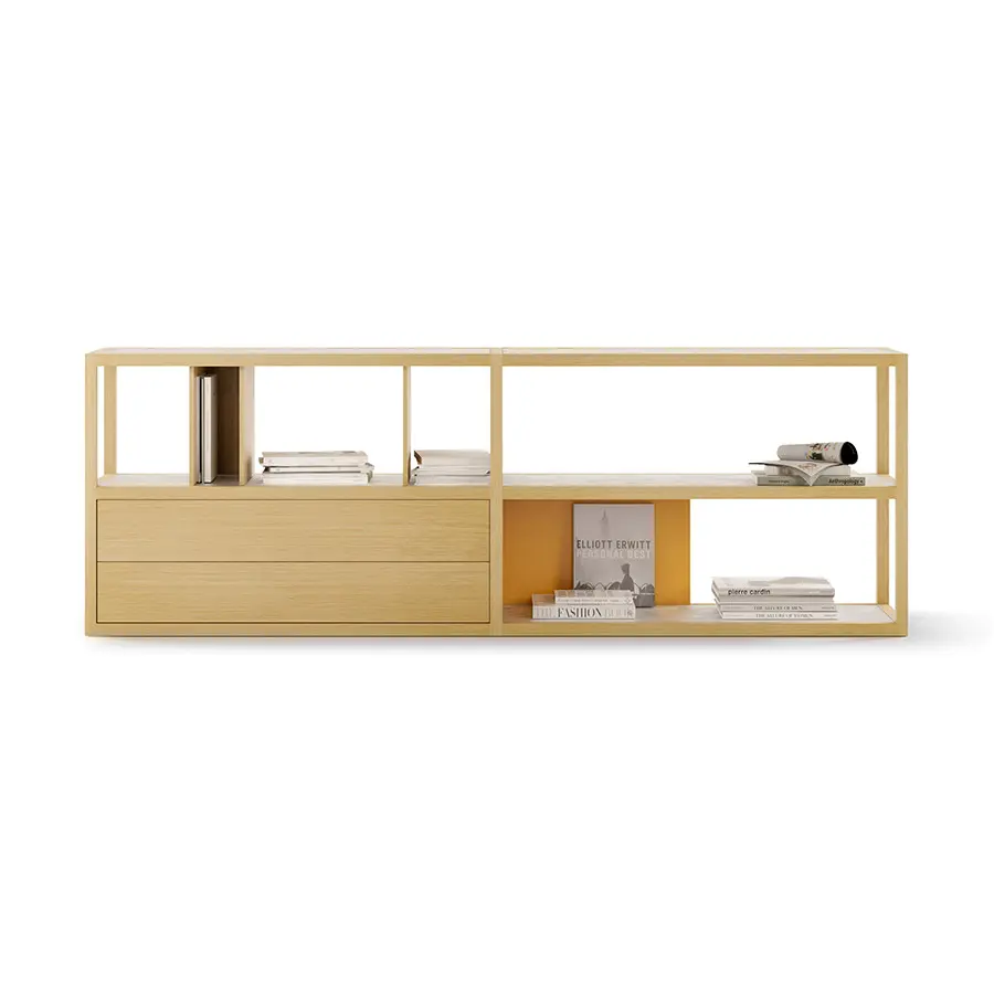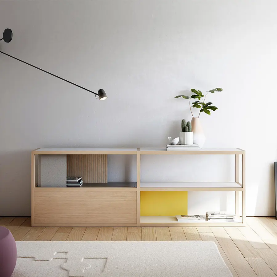 Para el diseño de la colección Kai hemos colaborado con el prestigioso diseñador francés Jean Louis Iratzoki. Juntos hemos creado un sistema que se caracteriza por la combinación de madera maciza con diferentes materiales como lacas de colores, fieltro e incluso mármol. Es decir, se combinan materiales nobles y de calidad con materiales más frescos y actuales. La personalidad de cada pieza dependerá de los elementos utilizados para configurarla: versiones más abiertas o más funcionales, más coloristas o más sobrias…