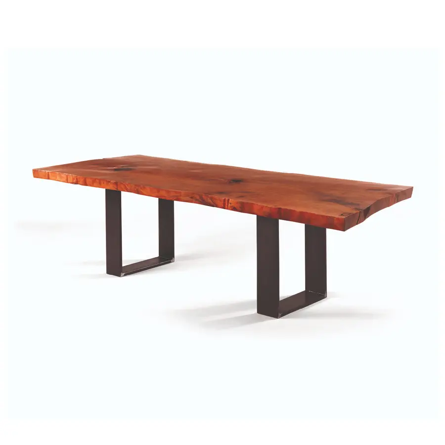 Mesa realizada con superficie en madera maciza de Kauri, madera milenaria de Nueva Zelanda, combinada con una base en hierro con sección a “U” y soldaduras a la vista. Acabado: a base de aceite/cera natural de origen vegetal con extractos de pino.