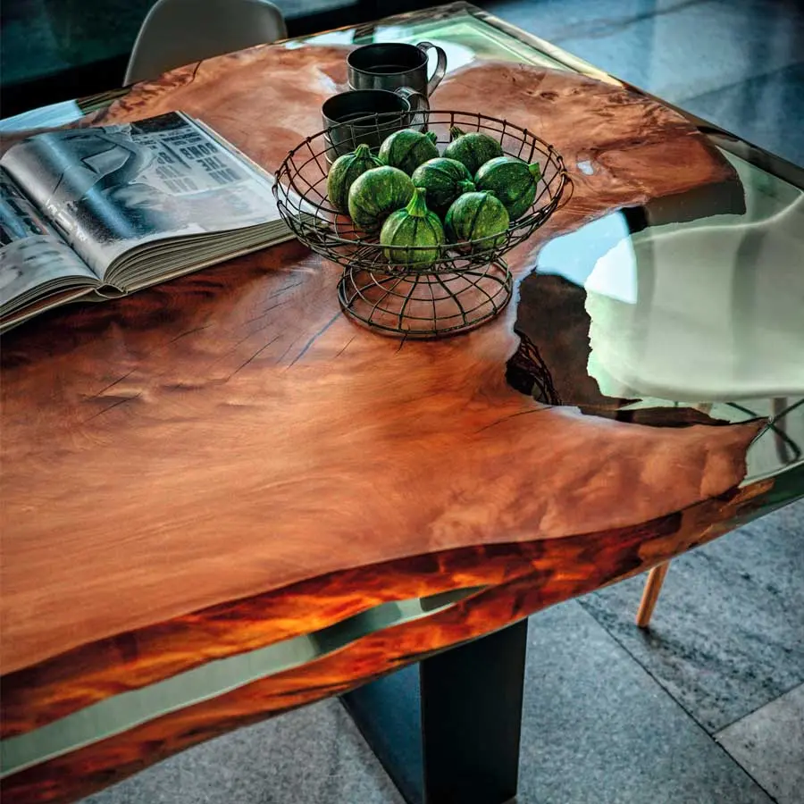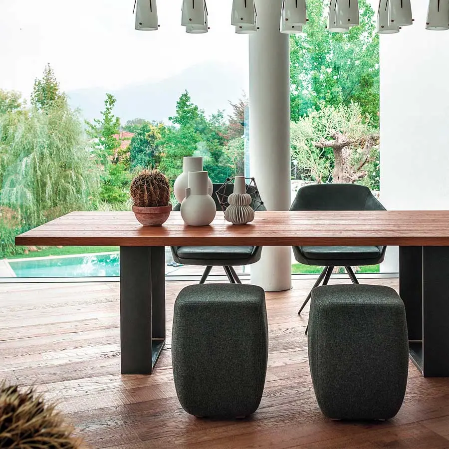 Mesa realizada con superficie en madera maciza de Kauri, madera milenaria de Nueva Zelanda, combinada con una base en hierro con sección a “U” y soldaduras a la vista. Acabado: a base de aceite/cera natural de origen vegetal con extractos de pino.