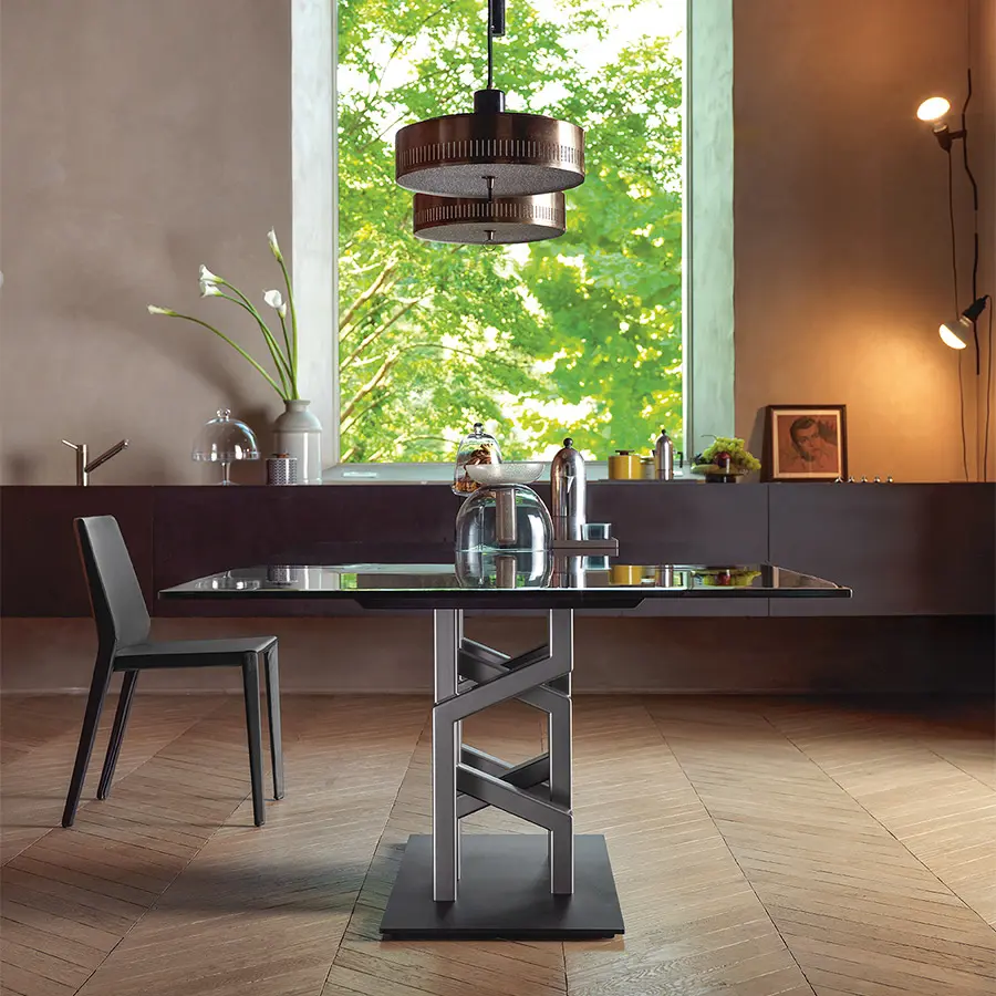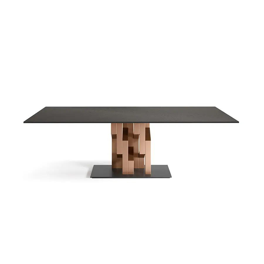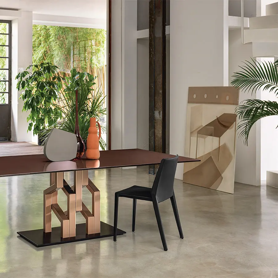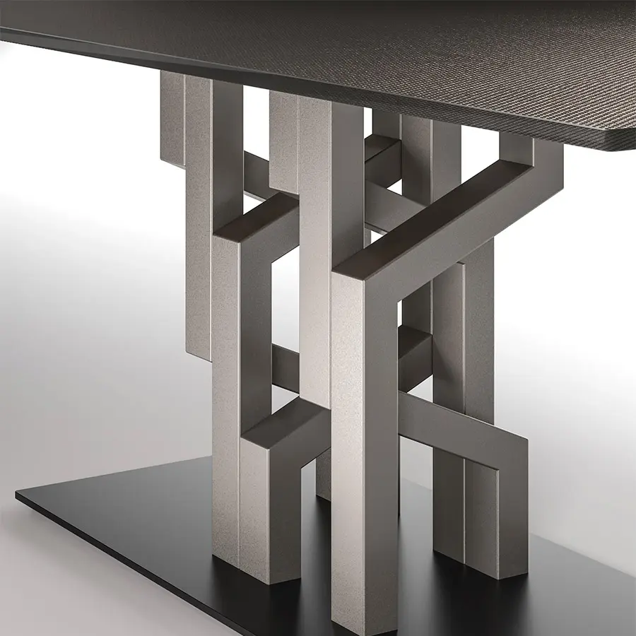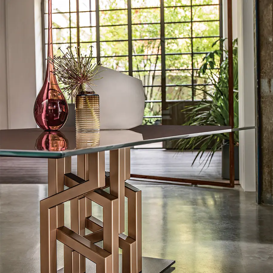 Mesa con base compuesta por 7 elementos en metal pintado, acabado Tierra Quemada o Gris Platino. Tapa en vidrio templado de 15 mm, disponible en las siguien tes variantes: vidrio transparente retrobarnizado con tonalidades metálicas; vidrio acidado retrobarnizado con tonalidades metálicas; vidrio fundido retrobarnizado con tonalidades metálicas.