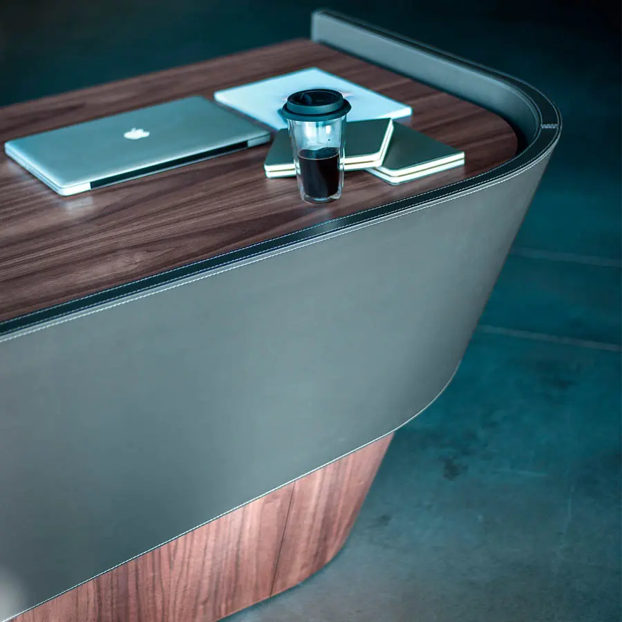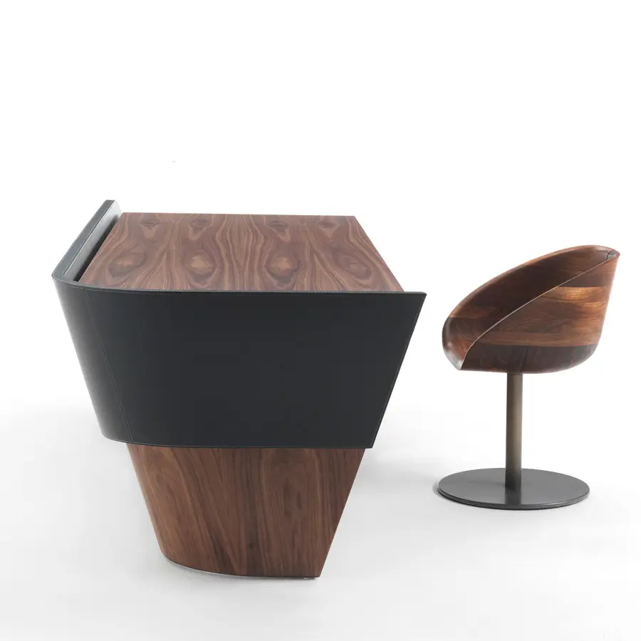 Escritorio de alta gama caracterizado por líneas suaves y fluidas, compuesto por una parte superior curva y un panel frontal que puede ser enchapado o cubierto con cuero. Está equipada con una práctica cómoda compuesta por tres cajones ensamblados con juntas de cola de milano y ranura lateral de apertura.