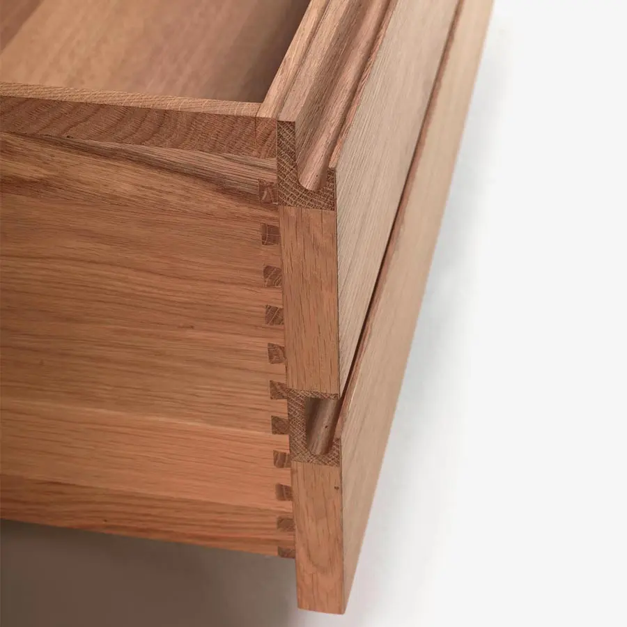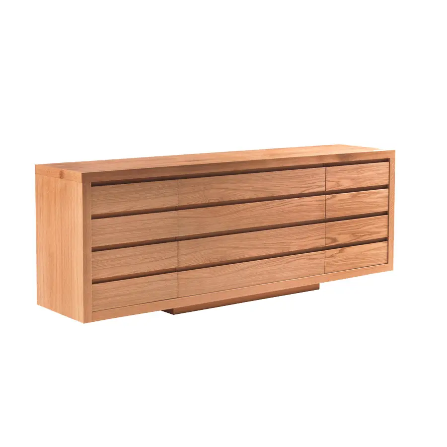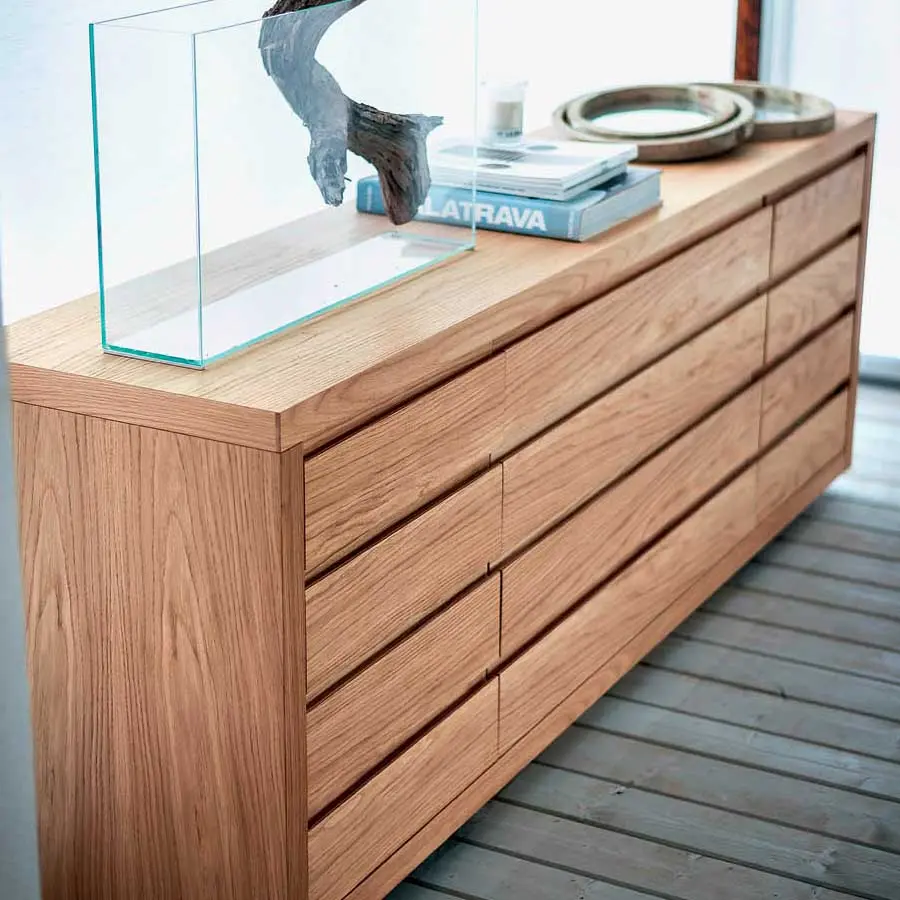 Cajonera en madera alistonada y madera maciza, caracterizada de frontales completamente lisos dotados de tirador embutido en el frente. Los cajones están realizados con tradicional empalme de cola de Milano y están dotados de deslizamiento sobre guías metálicas. Acabado: a base de aceite/cera natural de origen vegetal con extractos de pino. Disponible en distintos formatos, con puertas y cajones.
