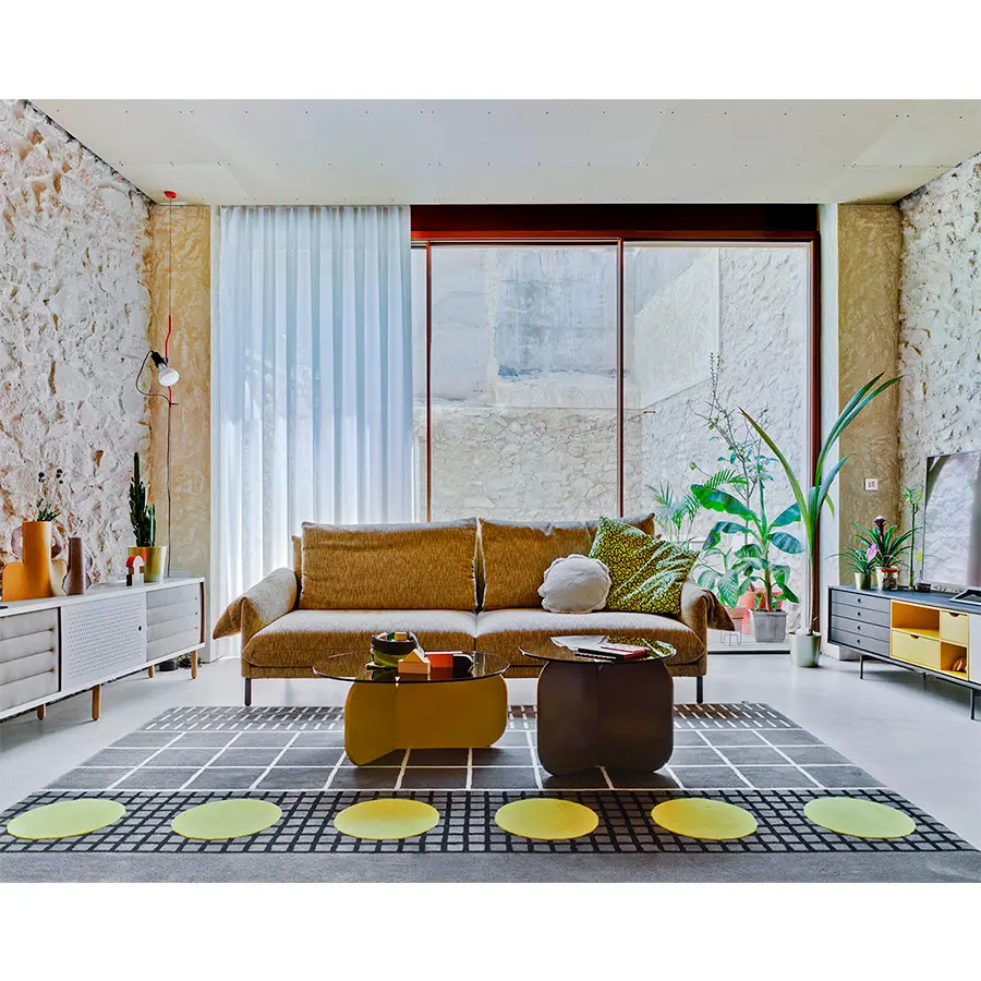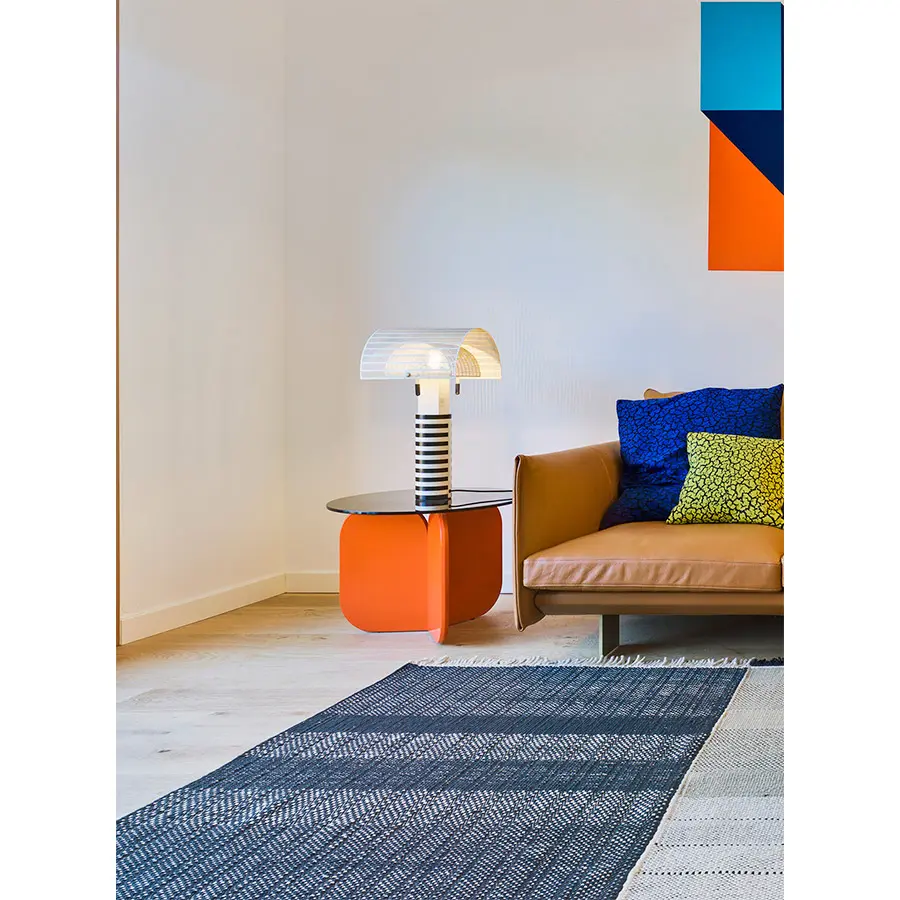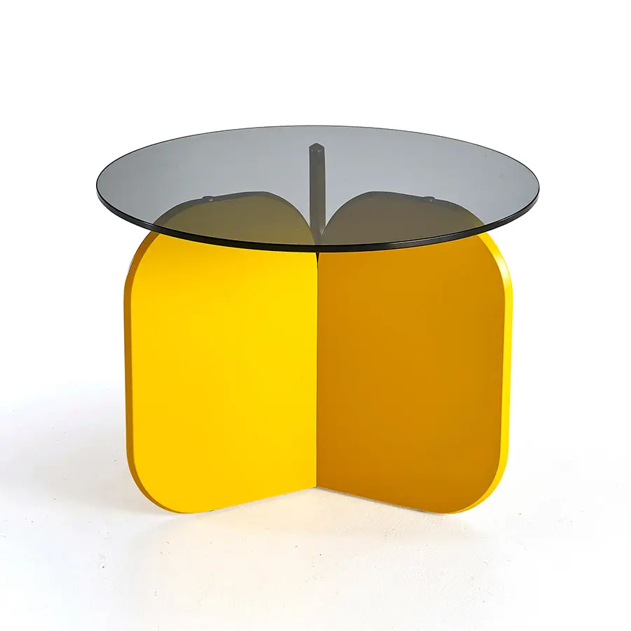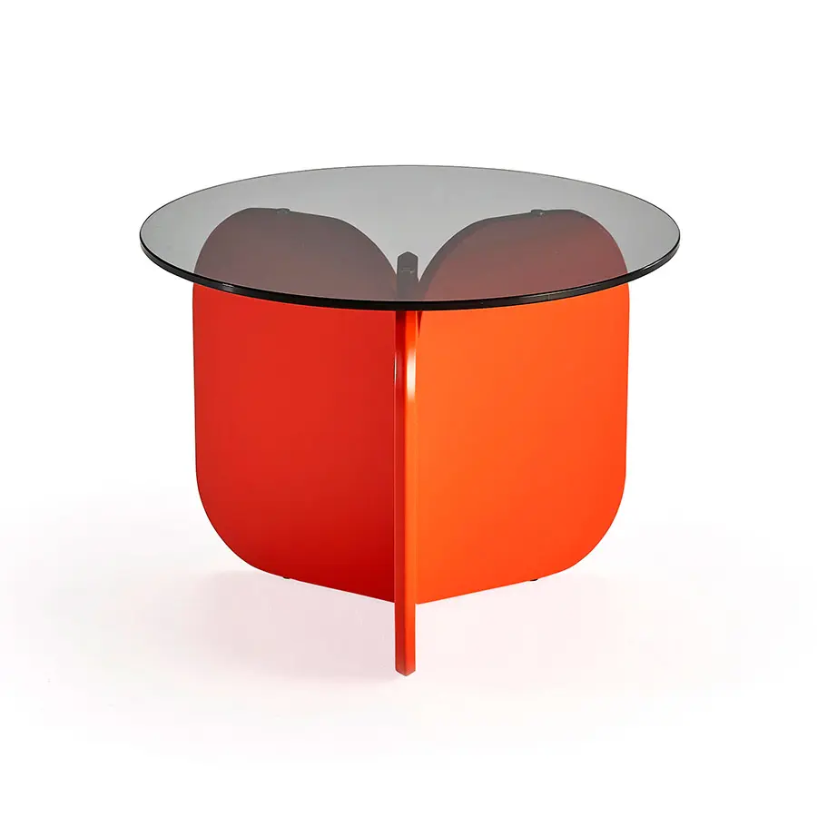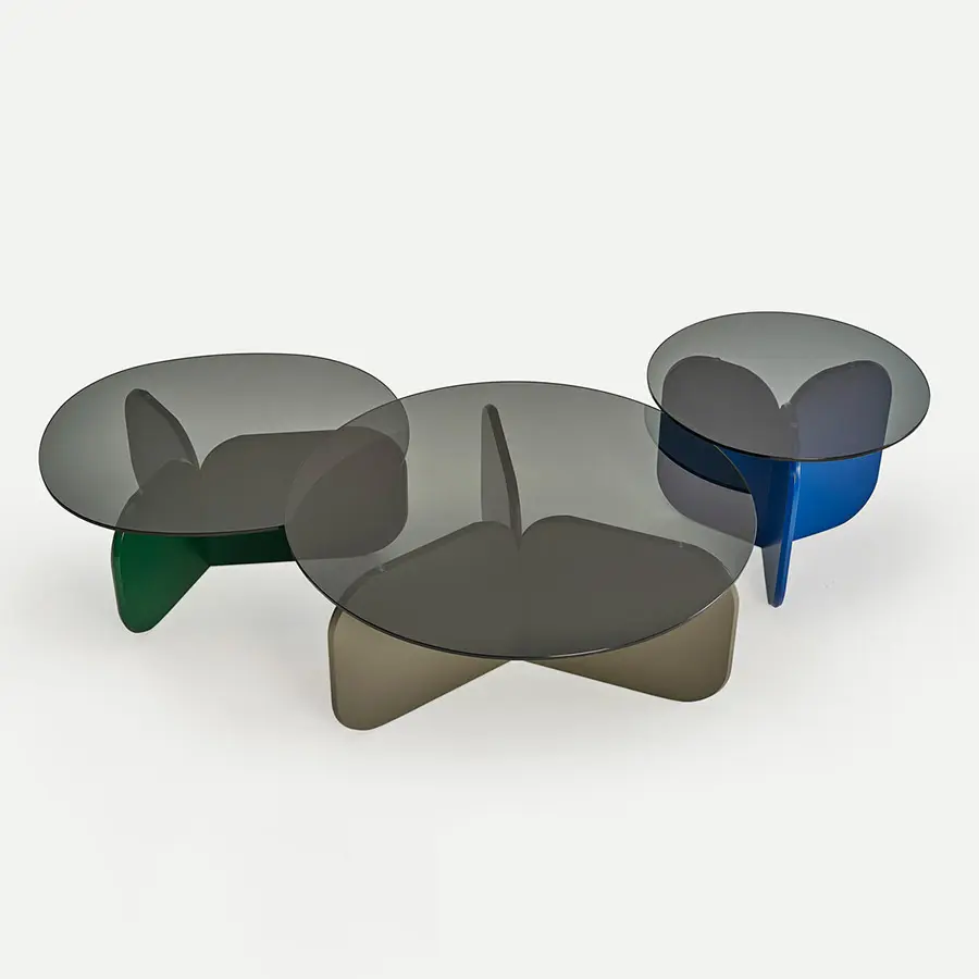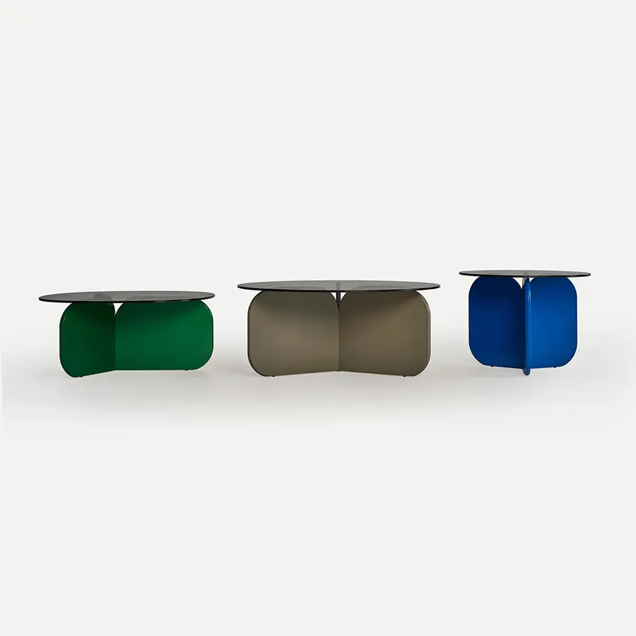 Las líneas curvas de las mesitas de La Isla, con sus tres alturas y la forma de sus sobres, redondo u ovalado, hacen que puedan interactuar entre ellas. Las bases, con forma de aspa, recuerdan formalmente al respaldo de los bancos, sin duda el elemento distintivo común a toda la familia. Los sobres son de cristal fumé por lo que dejan entrever la tan característica base, la cual puede ser lacada en todas las opciones de laca de nuestra carta.