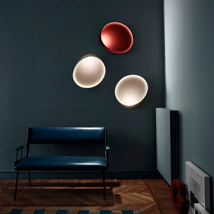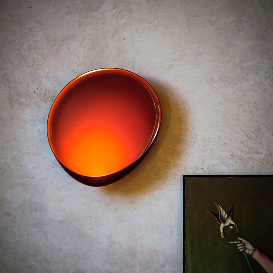 Una mancha densa de tinta que se extiende en el agua, la visión aérea de un lago, de perfil irregular, como muchas de las formas que encontramos en la naturaleza. Estas son algunas de las imágenes que evoca Lake, lámpara de pared caracterizada por una forma orgánica, asimétrica, con un contenido elevado de color. El espacio definido por el borde, doblado hacia el interior, acoge y esconde la fuente luminosa de LEO, que regala una luz líquida y sorprende por su colocación: desde el borde exterior se propaga hacia el interior, deslizándose a través de la superficie brillante. Cuando está encendida, los colores densos y desaturados/mates de los difusores blanco y rojo se vuelven brillantes y llamativos; Lake mantiene, incluso cuando está apagada, toda su fuerza decorativa y una personalidad elegante y mudable. Gracias a la forma asimétrica, Lake se presta especialmente a composiciones que dan color, luz y movimiento incluso a paredes de gran tamaño.